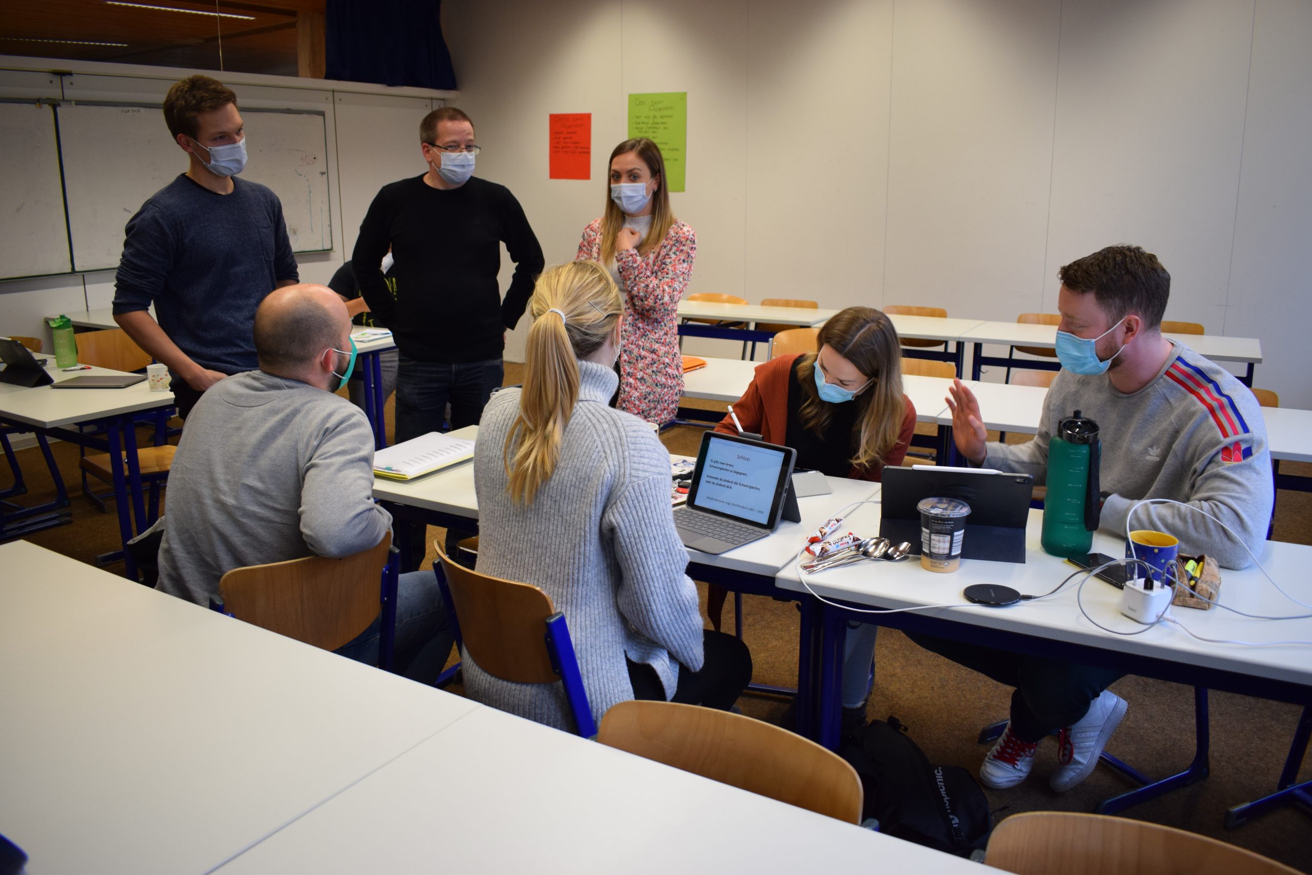 Dabei hat es sich bewährt, dass das Kollegium sich für einen Austausch in Präsens, aber Corona-Regel-konform in Gruppen entschieden hat.