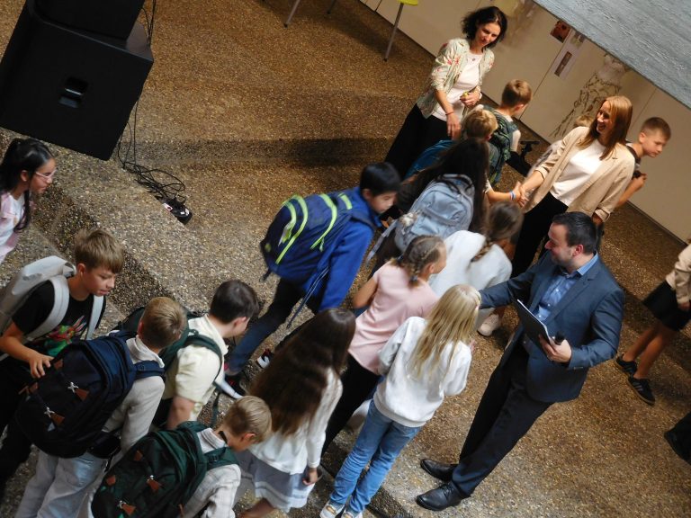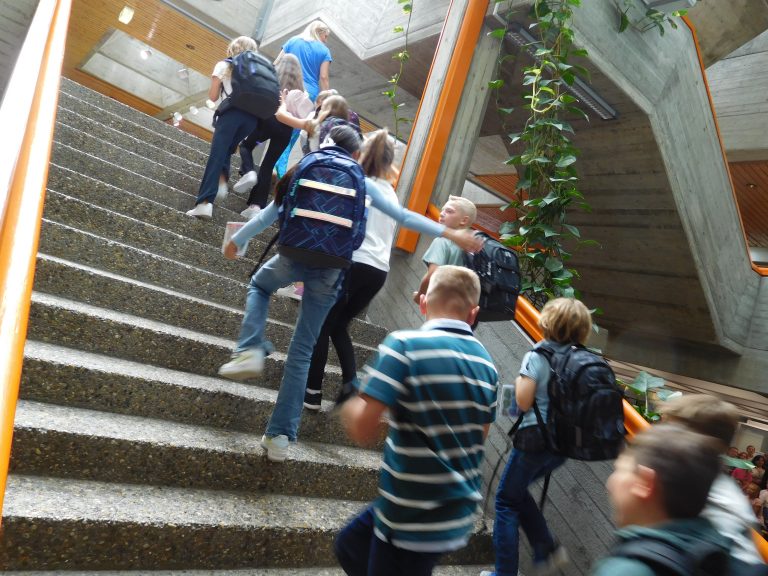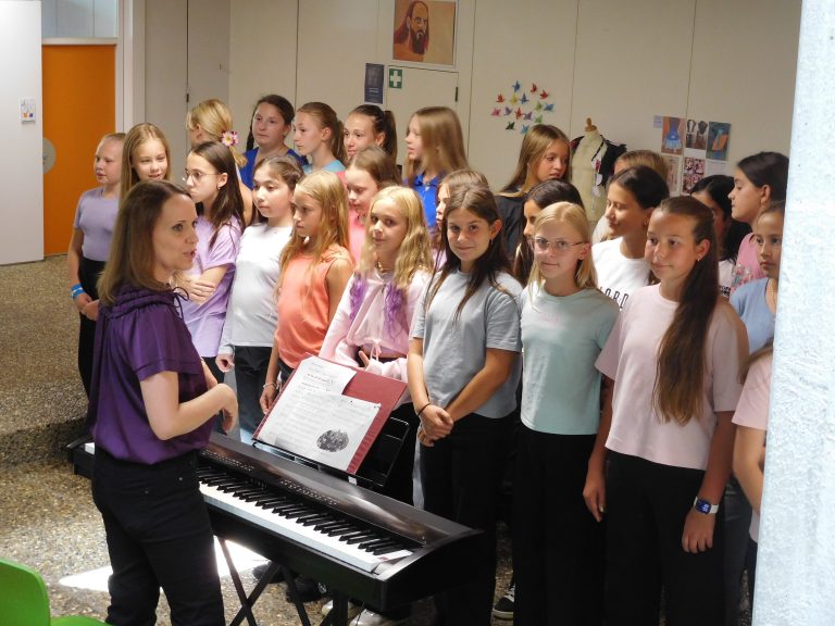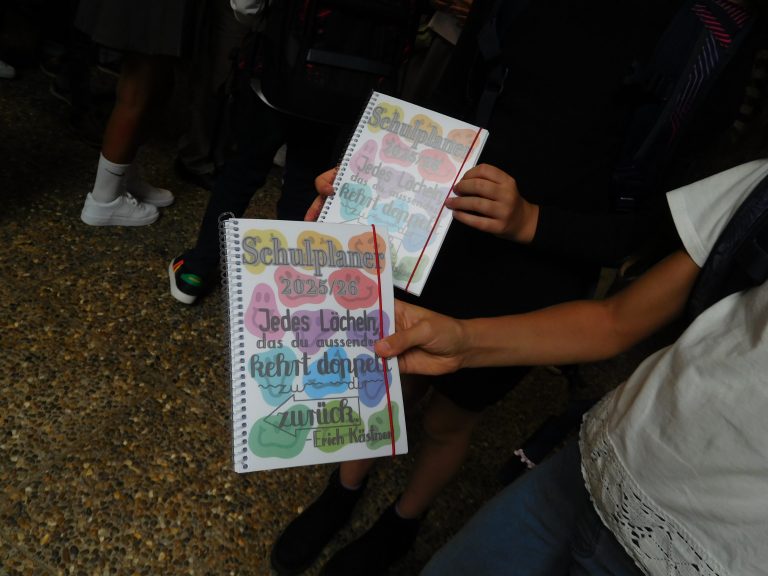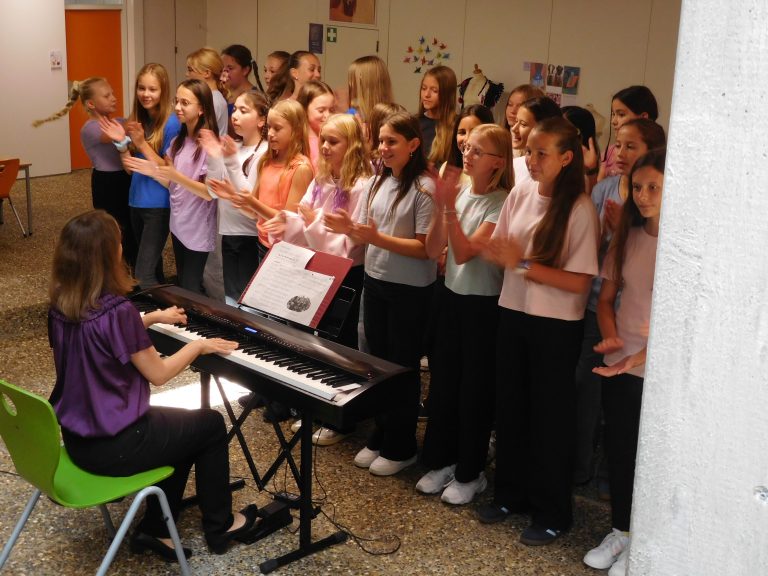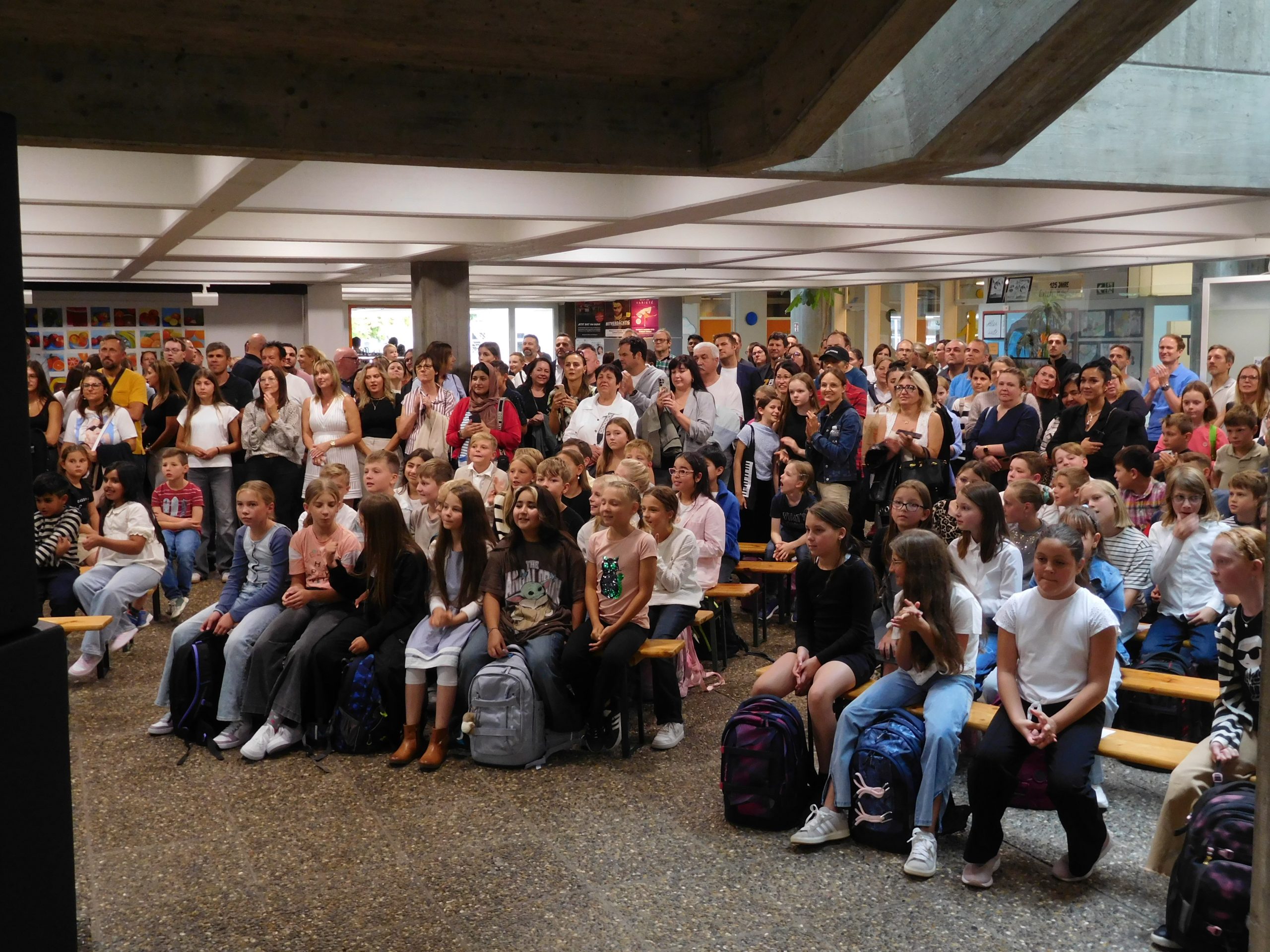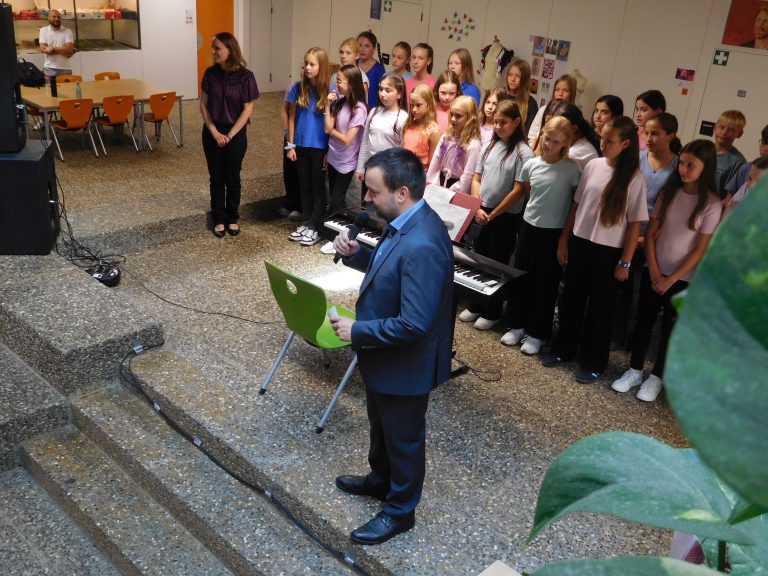 „Welcome everybody“, mit diesem Lied wurden die Jugendlichen und ihre Eltern vom Unterstufenchor unter der Leitung von Corinna Gerlach willkommen geheißen. Und das berührende Lied „Eine Sprache“ zeigte die Verbundenheit innerhalb der Schule und mit der Welt. Schulleiter Stephan Arnold stellte in seiner Begrüßung das Leitbild „RESPEKT!“ vor. Jedem einzelnen Buchstaben dieses Wortes sind dabei weitere Wörter und Bereiche zugeordnet. So versteckt sich hinter dem T etwa Teamfähigkeit. Das bedeute nichts Abstraktes, sondern auch, so Arnold, dass man aufeinander achtgebe oder einander helfe. Anhand weiterer Beispiele erläuterte Arnold das Miteinander am EKG, das zum Leitbild geführt hat und zugleich Ausdruck des Leitbilds ist. Aufeinander zuzugehen und miteinander früh ins Gespräch zu kommen, sei wesentlich für einen gelungenen Austausch. Auch verwies Arnold darauf, dass es neben den vielen Räumen und Gesichtern, auch Neuerungen im Schulbetrieb für die Schülerinnen und Schüler der Klassen fünf gebe, etwa die Rückkehr zu G9, Mentoring sowie neue Möbel für die Räume der Klassen fünf, „auf denen vor Euch noch niemand gesessen oder gearbeitet hat.“ Alle für die neuen Fünfer und ihre Eltern wichtigen Personen traten in der Folge nach einer kurzen Vorstellung durch den Schulleiter kurz auf die Bühne der Aula, etwa der Elternbeiratsvorsitzende Herr Barth, die Beratungslehrerin oder aber die Vertreter/innen der Schulsozialarbeit und des Schulleitungsteams sowie die Klassenlehrerteams und jeweiligen Fachlehrer und Fachlehrerinnen. Nach der abschließenden Begrüßung im Namen der gesamten Schülerschaft durch Schülersprecherin Laureen Kultermann, ging es dann für die jeweiligen Klassen gemeinsam mit ihren neuen Klassenlehrerinnen und Klassenlehrern über die Bühne in die neu ausgestatteten Klassenzimmer; auf dem Weg dort hin wurden alle einzeln von Schulleiter Stephan Arnold mit Handschlag persönlich begrüßt und erhielten als Geschenk einen Schulplaner. In den nächsten Wochen erwartet die neuen Fünfer ein vielfältiges Programm zum Thema „Ankommen“ am EKG. Das Konzept „Es Klappt Gemeinsam“ sieht vor, dass die Fünftklässler ein ganzes Jahr lang von der Schulsozialarbeit und den Lehrerteams dabei und beim Lernen begleitet werden.
