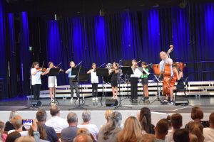 Endlich wieder dieses Kribbeln vor dem Auftritt! Endlich wieder auf der Bühne stehen! Endlich wieder zeigen dürfen, was man sich auf der Geige oder mit der Posaune über Jahre erarbeitet hat! Die Freude der Jugendlichen und der Musiklehrer über die langersehnte Chance eines Auftritts erfüllte die ganze Stadthalle und sprang schnell auf das Publikum über. Beim traditionellen Werkstattkonzert zeigten die verschiedenen Musikklassen und Ensembles des Gymnasiums, was sie im Laufe des Schuljahrs einstudiert haben. Dieses Ziel vor Augen war Motivation und Antrieb für viele Schülerinnen und Schüler des Musikprofils, um all die vielen Übungsstunden durchzuhalten – wobei die Vorbereitung des Konzertes in diesem Jahr unter erschwerten Bedingungen stattfand, da erst ab den Osterferien verlässlich gemeinsam geprobt werden konnte. Die Begeisterung kam zum Glück zurück und so entlockten die Schülerinnen und Schüler der Bläser- und Streicherklassen ihren Instrumenten nicht nur Rock- und Popmusik von ABBA bis Queen. Auch Beethovens „Ode an die Freude“ erklang in der bis zum letzten Platz gefüllten Stadthalle. In den Musikklassen und Ensembles kam es dabei nicht nur auf die eigenen Fortschritte beim Erlernen des Instrumentes an. Auch das Zusammenspiel verlangte Gespür und Taktgefühl. Bei der Vorbereitung wurden die Musiklehrer des EKG wie Martin Gradner unterstützt von den Fachlehrern der Jugendmusikschule Eislingen, Hyun Ji You und Daniel Rehfeldt. Die Singeklasse der Stufe 5 berührte das Publikum mit einem hebräischen Lied, die Percussionsgruppe unter Oliver Locherer brachte heiße Rhythmen auf die Bühne. Zu einem besonderen Experiment startete die Musikprofilklasse 9, die Ausschnitte aus ihren Lieblingsstücken raffiniert miteinander kombinierte. Zum Abschied vom Musikprofil bewies der Jahrgang 10 sein Können mit „California dreamin‘“ und bedankte sich damit bei den Musiklehrern. Dann traten die Chöre der Schule auf die Bühne und erfüllten den ganzen Saal mit Leben, der Unterstufenchor unter der Leitung von Corinna Gerlach, unterstützt von der Profilklasse 8, mit einem afrikanischen Volkslied, der Oberstufenchor unter Annette Gander mit einem Abendlied. Auch wenn der Chor in Coronazeiten geschrumpft ist, so bewiesen doch die verbliebenen weit über 30 Stimmen ihr bewegendes Können und ihre Begeisterung. Eine bunte Vielfalt an Instrumenten fand sich im Unterstufenorchester unter der Leitung von Uta Oellig zusammen und brachte mit Eduard Griegs „In der Halle des Bergkönigs“ düster-romantische Stimmung in den Saal, bevor das große Oberstufenorchester mit Stephanie Kapfer die Zuhörer vom „Schwanensee“ träumen ließ. Nicht nur am Ende des Konzerts bedankte sich das Publikum mit begeistertem Applaus für diesen live dargebotenen Musikgenuss und würdigte damit all die Anstrengungen und die Ausdauer der Schülerinnen und Schüler. Möglich gemacht hat das Konzert das Engagement der Musiklehrerinnen und Lehrer, aber auch der Einsatz ehemaliger Schüler wie Fabian Sassmann, der immer noch an verschiedenen Instrumenten und in unterschiedlichen Funktionen mithilft.