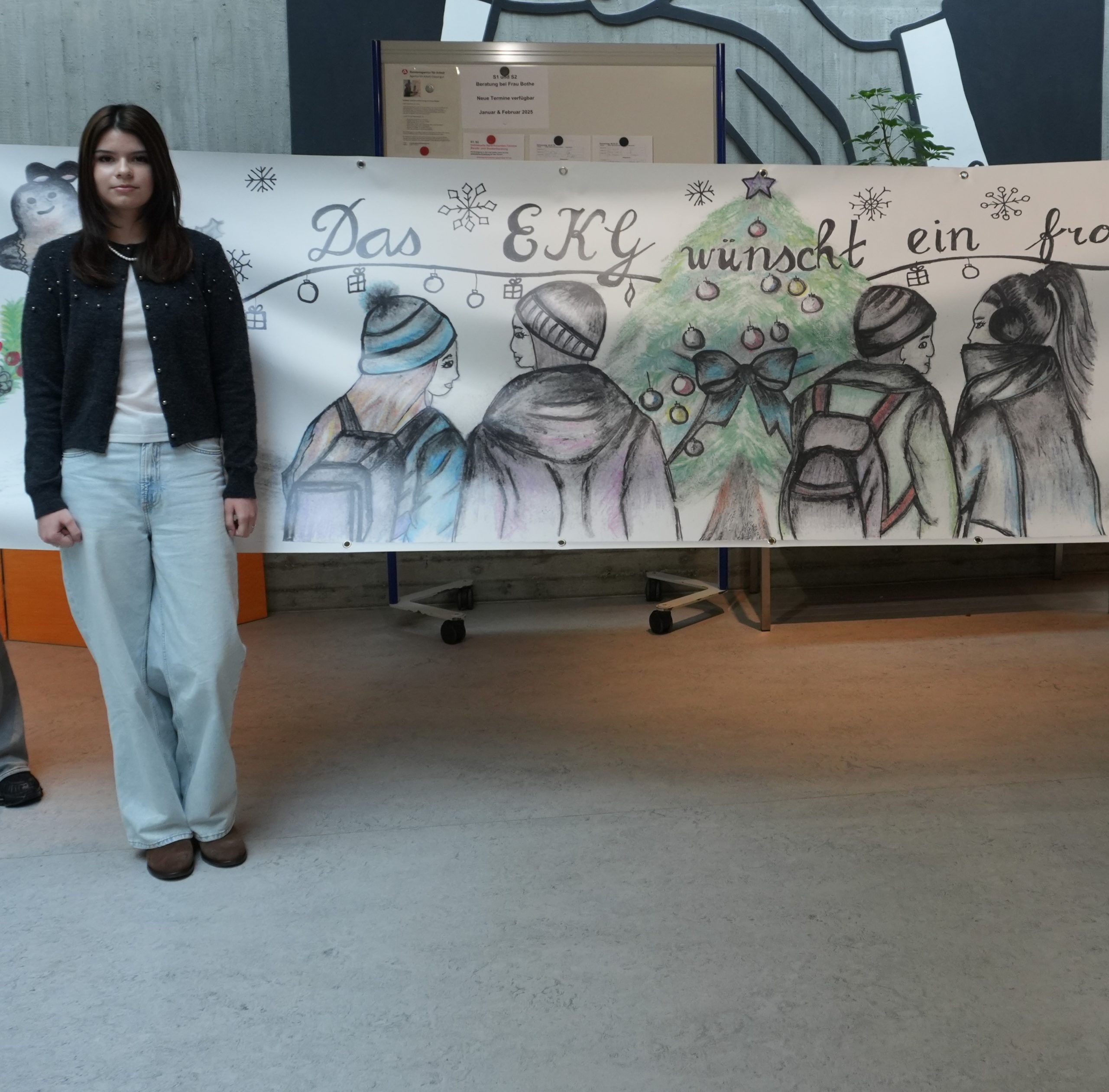 Natalia Lopez Cardanas aus der 9a hat einen Weihnachtsgruß gezeichnet, der auf ein großes Banner gedruckt wurde. Das Banner hing...