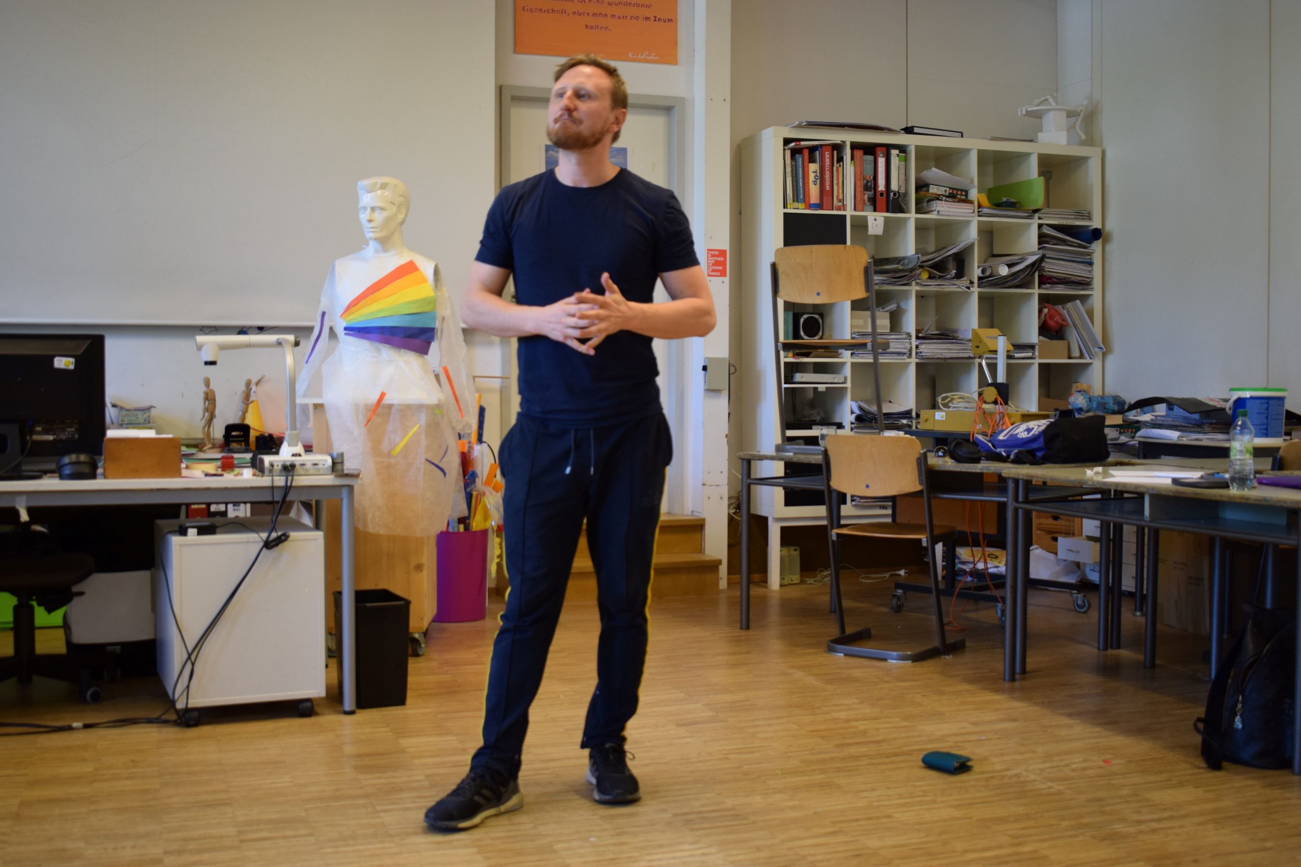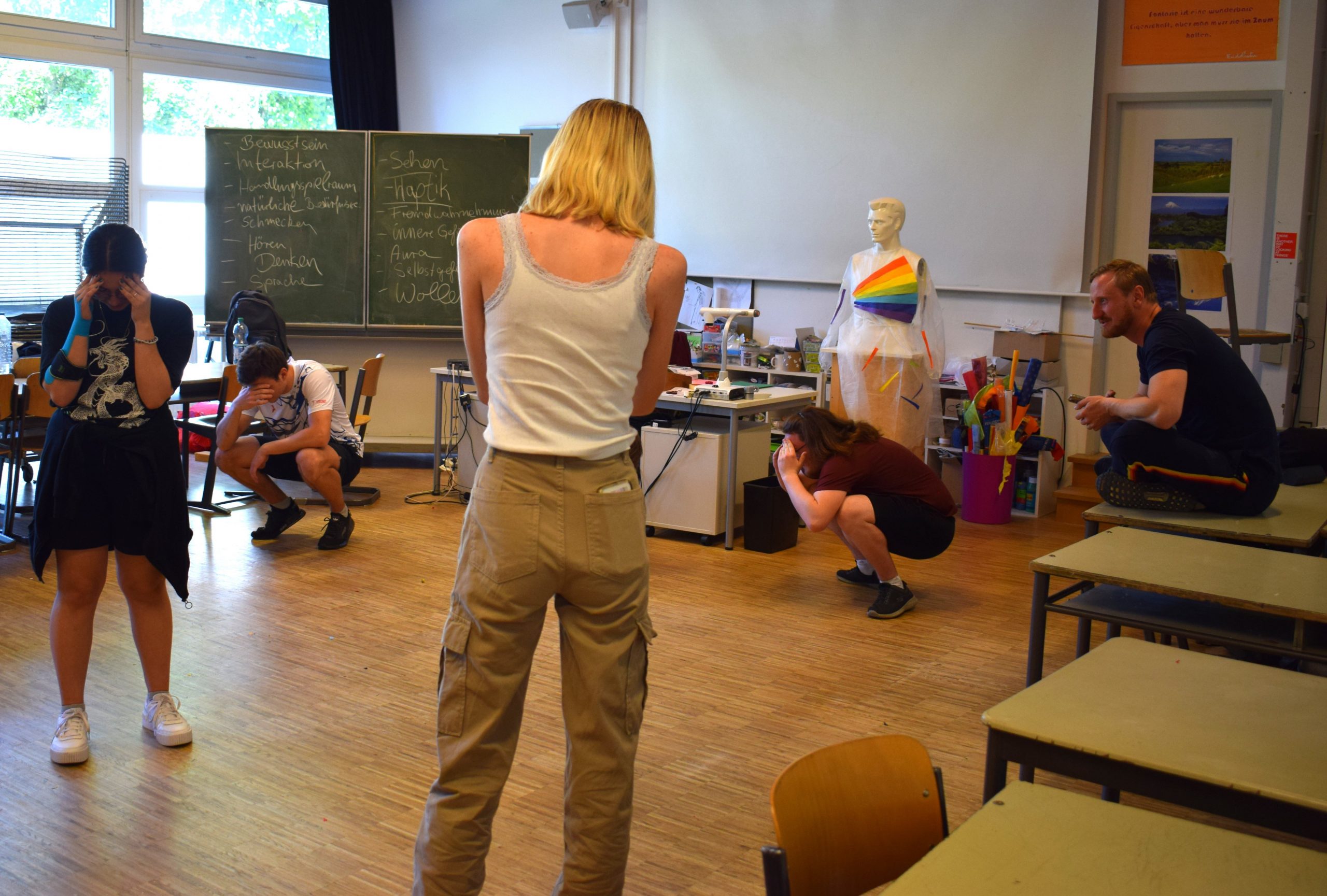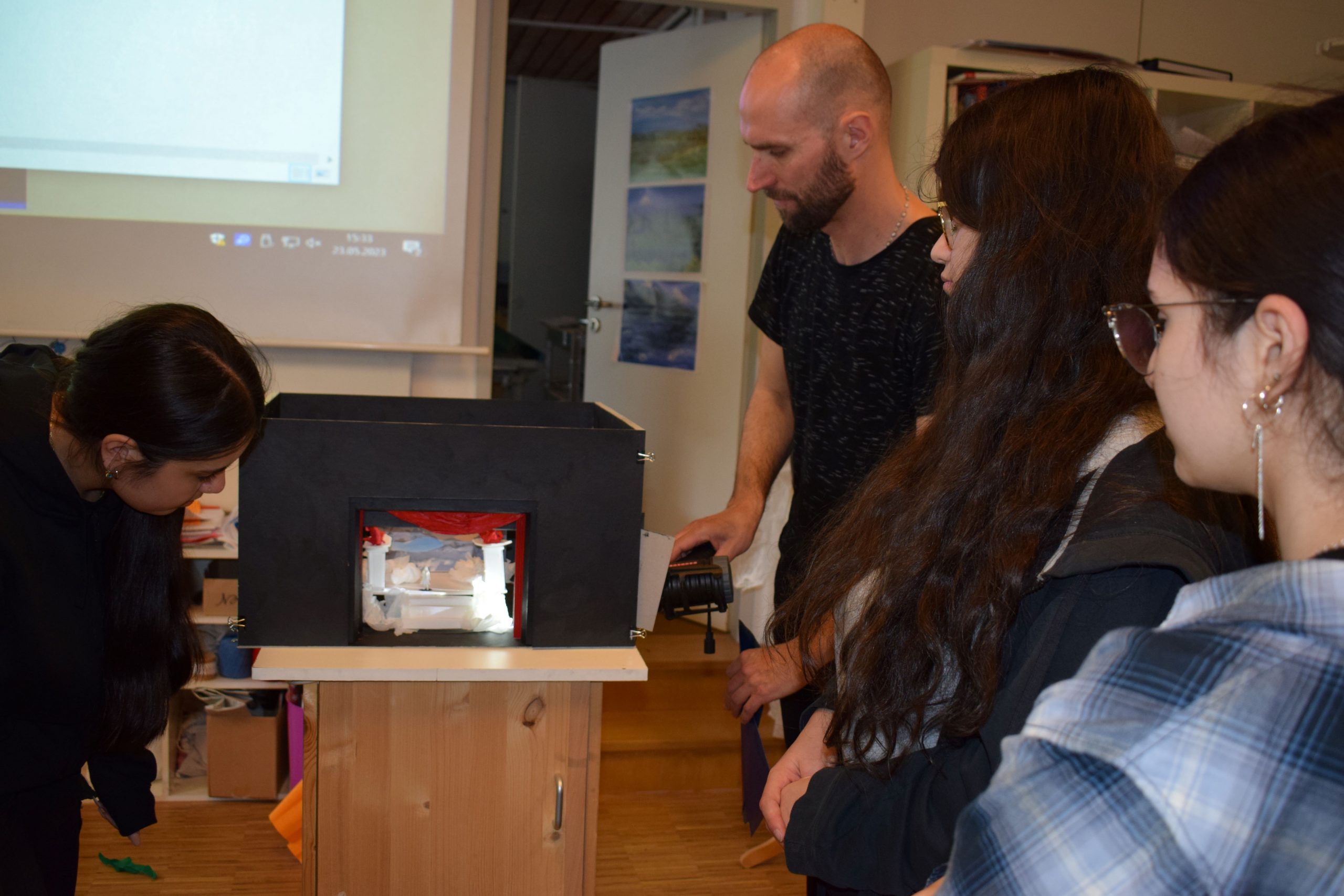 Dominik ging in die Knie, Malina tanzte ausgelassen und Melisa schaute Kristina tief in die Augen – für Emotionen war viel Raum im Kunstsaal des Erich Kästner Gymnasiums bei Theaterprojekt. Gleich zwei Workshops mit professionellen Theaterkünstlern bot die Schule den Schülerinnen und Schülern der Oberstufe. Im Rahmen des Landesprogramms „Lernen mit den Künsten” hatte die Kunstlehrerin Doris Vogel das Angebot für die Kurse „Bildende Kunst“ und „Literatur und Theater“ vermittelt. So ermöglichten der Bühnenbildner Manuel Kolip und der Filmschauspieler Michael Kranz einen Einblick in ihre vielfältige Arbeit. Die Jugendlichen kamen mit den beiden Profis ins Gespräch über die künstlerischen Berufe und erfuhren viel über die Erfahrungen auf der Bühne oder beim Film. Die beiden Künstler arbeiteten aber auch aktiv und kreativ mit den Jugendlichen. So entwickelten die Schüler gemeinsam mit Manuel Kolip eigene Ideen und bastelten Modelle für das Bühnenbild zu der Oper „Orpheus in der Unterwelt“. Himmel und Hölle wurden so in Symbole eingefangen und anschaulich gemacht. Dabei entstanden interessante Diskussionen darüber, wer denn heute die Rolle der Götter einnimmt und welche Urerfahrungen im Drama zum Ausdruck kommen. Zum zweiten Workshop kam der Schauspieler Michael Kranz, der nicht nur in Fernsehfilmen wie „Oktoberfest 1900“ mitspielte, sondern auch in Hollywood vor der Kamera stand, ans EKG. Er forderte die Schüler zur Selbsterfahrung durch verschiedene Übungen heraus. So stärkte er bei den Jugendlichen die Wahrnehmung des eigenen Körpers und der eigenen Ausstrahlung. Was passiert mit mir, wenn ich mein Gegenüber ganz lange ruhig ansehe? Und was machen die verschiedenen Körperhaltungen und Bewegungen mit mir und meiner Stimmung? Wie wirkt mein Auftreten auf andere? Die Übungen ermöglichten aufschlussreiche Selbsterfahrungen. Die Jugendlichen agierten darüber hinaus in selbstgewählten Rollen und waren fasziniert vom Feedback des Profis. Am Ende gab es ein Kompliment von Michael Kranz: „Ihr seid schon so weit, dass ihr euch bei einer Schauspielschule bewerben könntet.“ Die Workshops motivieren die Kurse, weiter mit Mitteln des Theaters zu spielen, denn die Kunst bietet vielfältige Möglichkeiten der persönlichen Weiterentwicklung und Entfaltung. Das Kultusministerium fördert im Rahmen des Landesprogramms „Lernen mit den Künsten“ ausgewählte Schulen, um den positiven Wert verschiedener kultureller Angebote für die Schüler erfahrbar zu machen.
