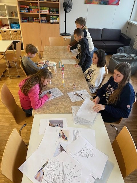 Das gemeinsame Vogelkunstprojekt war ein voller Erfolg! Schüler haben nicht nur die Schule verschönert, sondern auch Vögeln geholfen, Zusammenstöße mit Glasflächen zu vermeiden. Fenster im Treppenhaus am Haupteingang wurden mit WindowColor-Farben gestaltet.