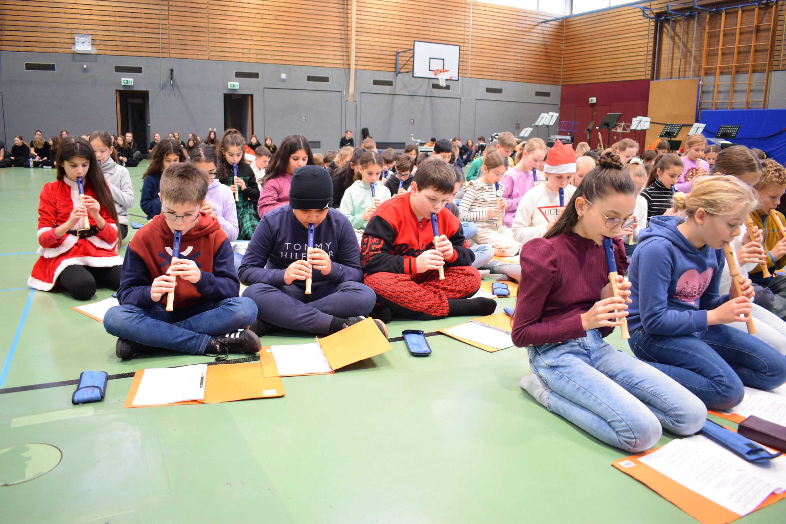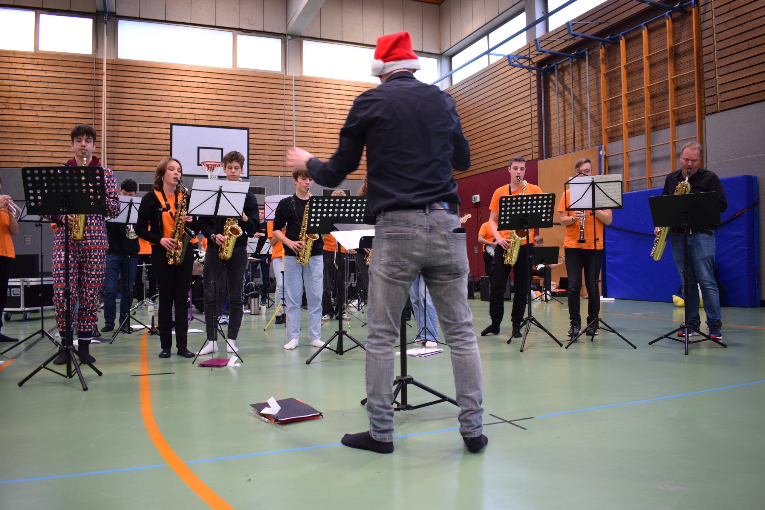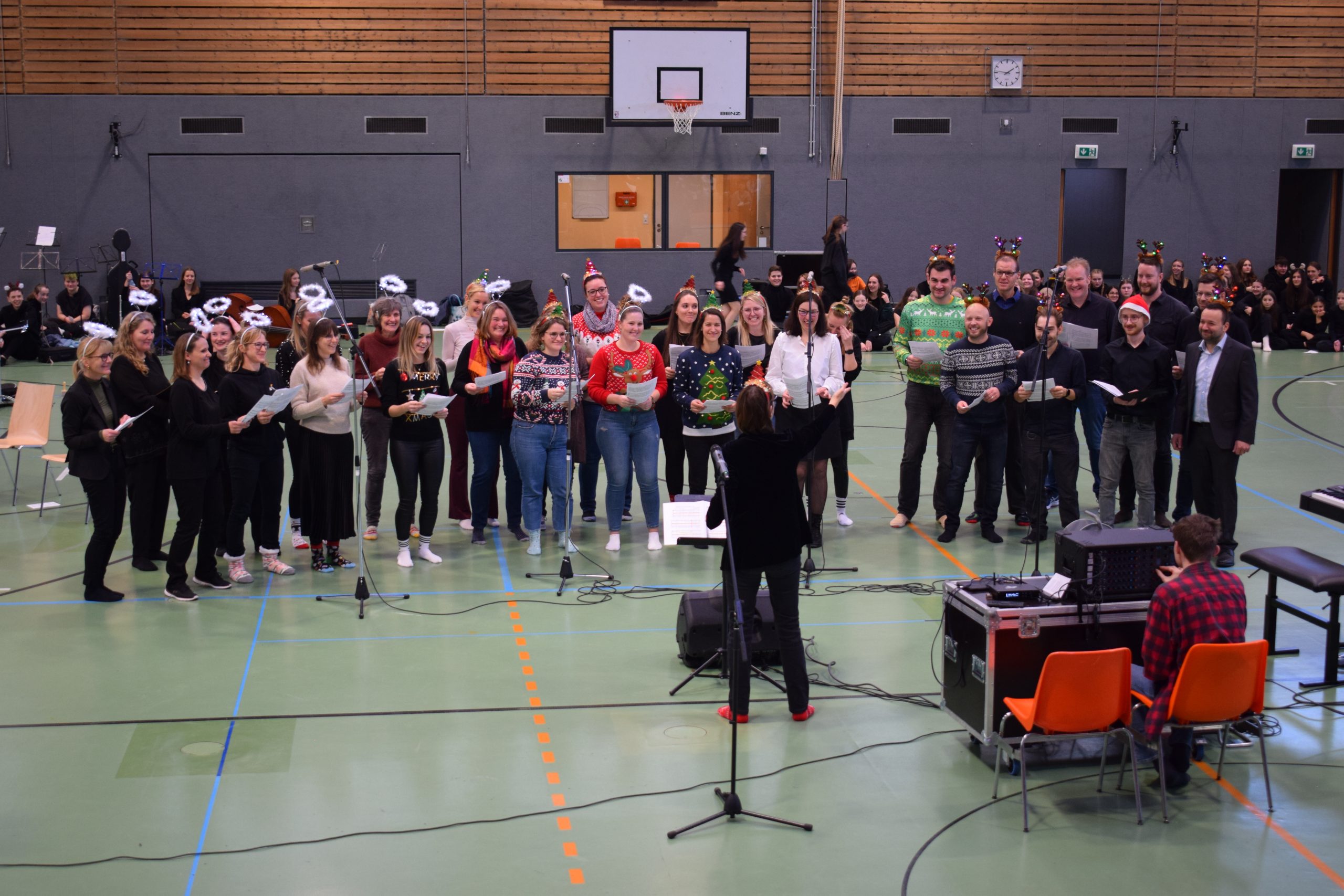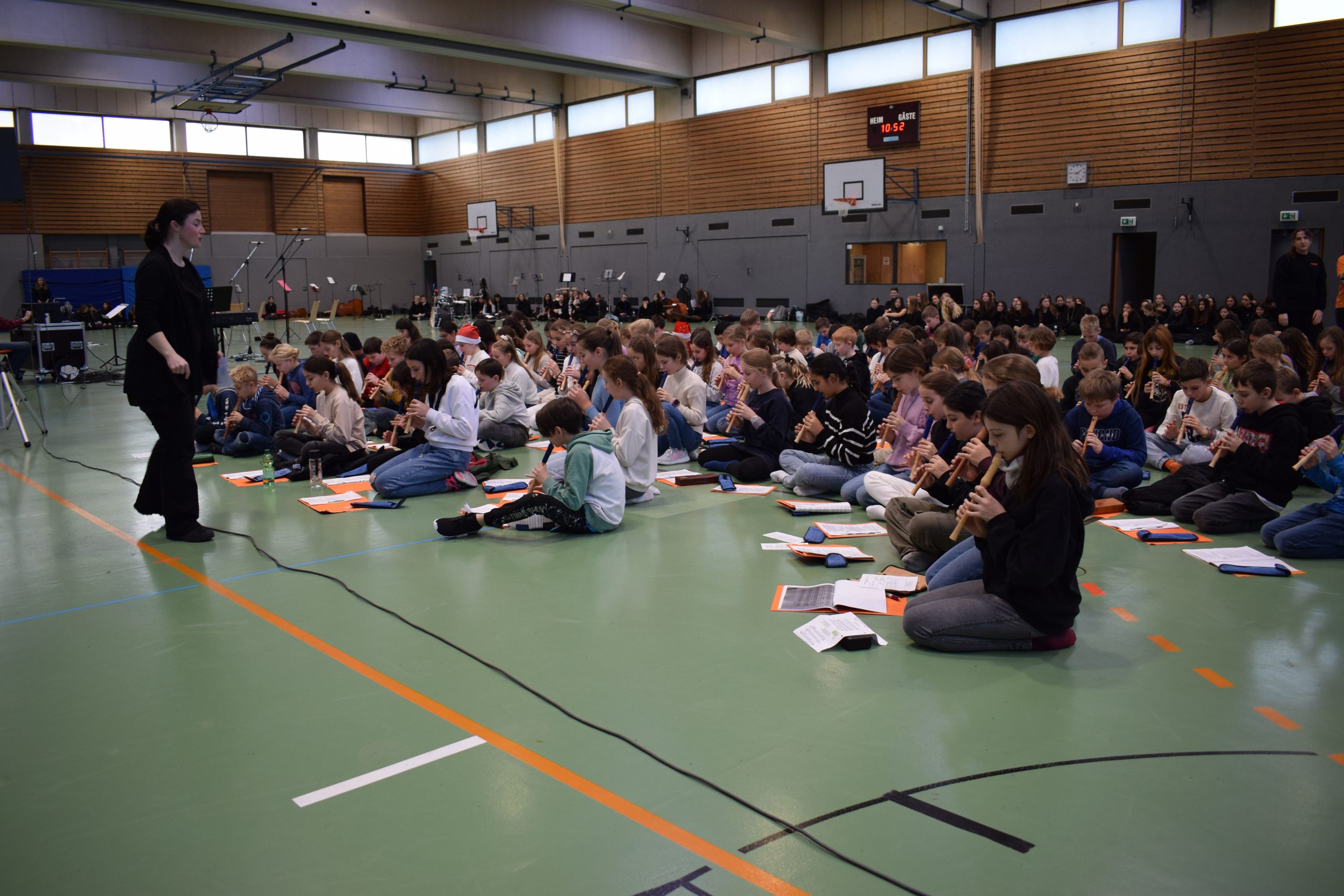 Alle Musikensembles und der Lehrerchor waren im Einsatz beim großen Weihnachtsmusizieren am letzten Schultag vor den Weihnachtsferien. Dazu hat sich die ganze Schule in der Öschhalle versammelt und genoss die fröhliche Stimmung.
