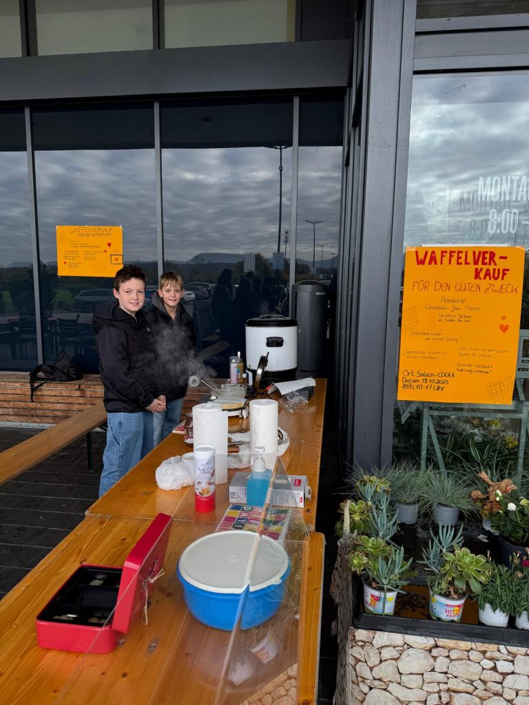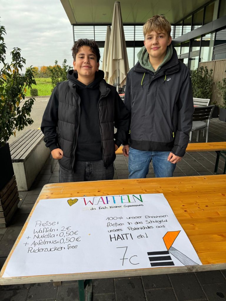 Es war eine großartige Aktion der Klasse 7c mit ihrer Klassenlehrerin Elisabeth Dorvil: Mit einem Waffelverkauf vor dem Edeka in Salach sammelten die Schülerinnen und Schüler 406,35 €. Mit dem Erlös wird das Schulgeld für das ganze Schuljahr für unser Patenkind Woodzaika in Haiti finanziert. Unterstützt wurde die Klasse dabei von einer Gruppe älterer Streitschlichter sowie von Eltern und Geschwistern, die auch mal nachhalfen, wenn der Waffelteig bei der großen Nachfrage ausging. In mehreren Schichten backten die Jugendlichen von 10 bis 17 Uhr unermüdlich Waffeln und verkauften sie an Passanten. Viele Besucher waren vom Engagement der Schülerinnen und Schüler so begeistert, dass sie zusätzlich spendeten. Ein herzliches Dankeschön geht an die fleißigen Waffelverkäufer und an alle großzügigen Spender!