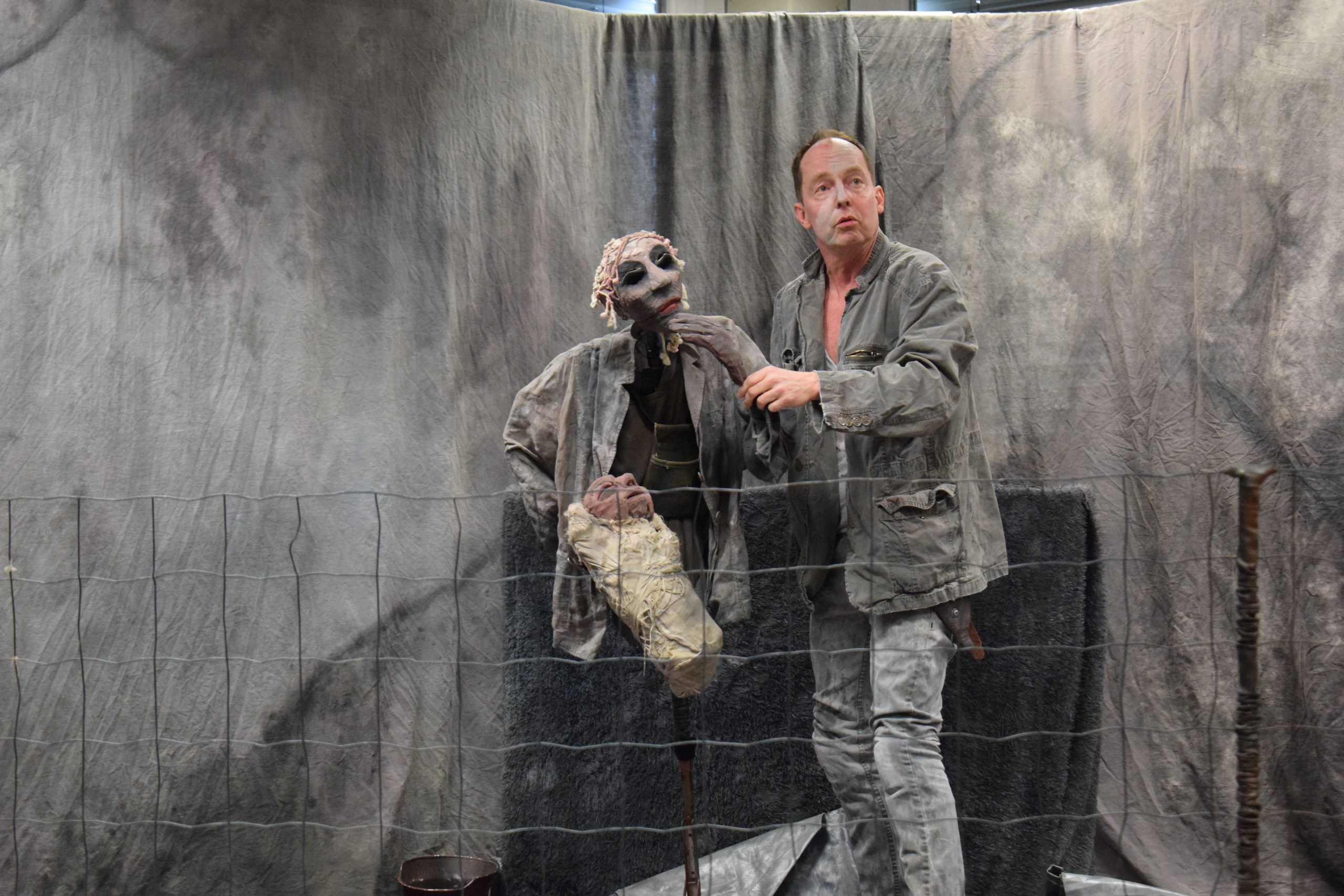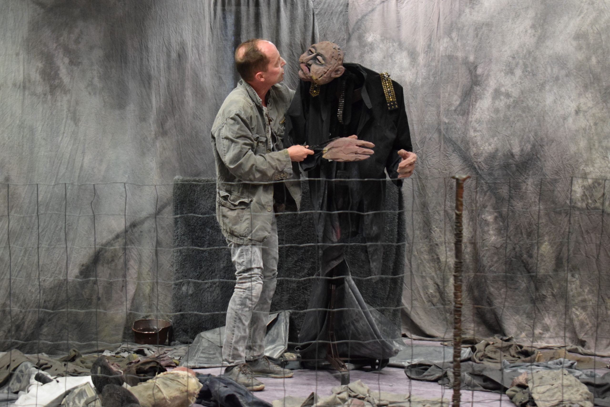 Als „Woyzeck“ zog Julian König vom THEATERmobileSPIELE Karlsruhe in einem eindrucksvollen Kammerspiel Schüler des Erich-Kästner-Gymnasiums und des Freihof Gymnasiums in den Bann dieser abgerissenen Figur von Georg Büchner. In einer Ecke des Musiksaals des EKG war eine bedrückende Kulisse aus Überresten eines inneren und äußeren Krieges, aus einem Berg von grauen Altkleidern aufgebaut. Darin ereignete sich die verstörende Darstellung einer verstörenden Welt, aus der im Laufe des Stückes die Figuren einer bedrohlichen Gesellschaft als fratzenhafte Stabpuppen auftauchten. Mit atemberaubender Schauspielkunst wechselte Julian König zwischen Woyzeck, den er verkörperte, und den Rollen des Doktors und des Hauptmanns, die er als Puppen zum düsteren Leben erweckte. So wurde es ein Spiel mit sich selbst, ein innerer Kampf zwischen der eigenen Zerrissenheit und den Forderungen der Gesellschaft. Diese Stabfiguren, von einem professionellen Puppenbauer als ausdrucksstarke, augen- und seelenlose Horrorgestalten angelegt, tyrannisieren den mittellosen Soldaten Woyzeck. Sie nutzen seine prekäre Situation aus für Dienstleistungen und für medizinischen Versuche. Dabei leben sie auch ihre vermeintliche moralische Überlegenheit und ihre Machtphantasien an ihm aus. Das wurde durch bedrohlich verzerrte Stimmen aus dem Off unterstrichen. So wurde Woyzecks Umgebung zu einer nicht fassbaren, absurden Welt. Und die verirrte, verwirrte Seele Woyzeck verwickelte sich immer mehr in einem Käfig aus Zäunen und Wahngedanken, aus Abhängigkeiten und Not. Denn da ist auch noch seine Freundin Marie, Mutter des gemeinsamen Sohnes, für die er ja sorgen will, für die er sich abhetzt und müht, der er aber keine wahre Zuwendung schenken kann, weil keine Gefühle mehr übrig sind. Bedroht wird diese Beziehung durch die Avancen des großen und übermächtigen Tambourmajors gegenüber Marie, die beide ebenfalls als Puppenfiguren ins Spiel kommen. Gegen die glänzenden Ohrringe und schmeichelnden Worte, die der Major Marie schenkt, hat Woyzeck keine Chance. Und so sinkt Woyzeck immer tiefer in die graue, staubige, depressive Bodenwelt. Er wird vom Subjekt zum Objekt, zum „Indiviehduum“, während der Doktor und der Hauptmann von Freiheit und Moral schwadronieren. Um dies zu unterstreichen, wird die Textvorlage in dieser Inszenierung streckenweise wie eine Collage eingesetzt, als Stimmengewirr aus Gerüchten und Vorwürfen, aus Bibelstellen und Märchen, als Ausdruck einer zerrissenen Welt, in der nichts mehr zusammenpasst. Woyzeck, der sich nicht wehren kann, entwickelt immer stärkere autoaggressive Züge, denn aus seinem Albtraum gibt es kein Erwachen – bis sich die Spannung nicht im Widerstand gegen die Gesellschaft, sondern im Mord an Marie entlädt. Im Totentanz des grotesken Figurenkabinetts breitet sich eine unheimliche Stille aus, in der Julian König als Woyzeck die zentralen Sätze des Stücks an die Schüler richtet: „Bin ich ein Mörder, hä? Guckt euch selbst an!”. Die Inszenierung von Regisseur Thorsten Keilos hebt – auch durch Anklänge an Borcherts „Draußen vor der Tür“ – die zeitlosen, aktuellen Aspekte des Stücks heraus. Die Schüler folgten fasziniert dem Stück, das im Jahr 1836 als Fragment entstanden ist, weil Büchner es – selbst Opfer der politischen Verhältnisse – wegen seines frühen Tods nicht vollenden konnte. Das EKG hatte die Aufführung an die Schule geholt, um den Jugendlichen den Abiturstoff auf anschauliche Weise aus der Sicht der Hauptperson zu vermitteln und für sie lebendig zu machen. In der anschließenden Diskussion mit den Schülern des Abiturjahrgangs zeigte Julian König, dass „Woyzeck“ ein Stück ist, das auch wegen seiner Anspielung auf „Femizide“ sehr anspruchsvoll zu spielen ist. Aber es sei auch wichtig, den Menschen eine Stimme zu gehen, die keine Stimme mehr haben, die nichts mehr zu verlieren haben. Bei den Schülern ist ihm das an diesem Morgen gelungen, in einer Inszenierung, bei der die Jugendlichen auf Tuchfühlung gehen konnten mit herausfordernder Theaterkunst.