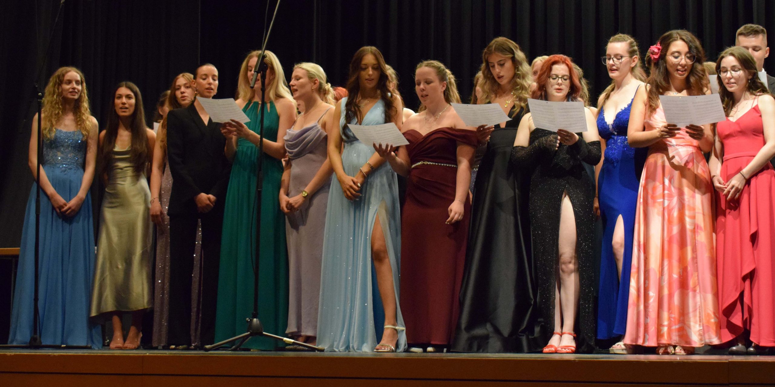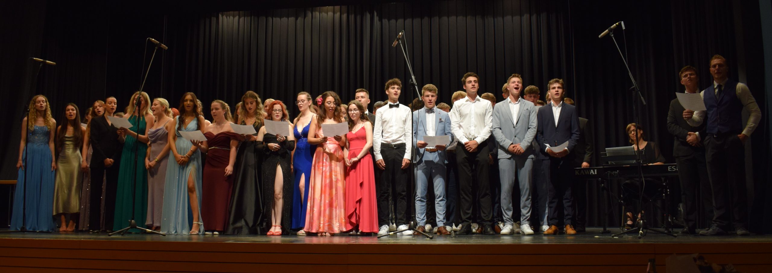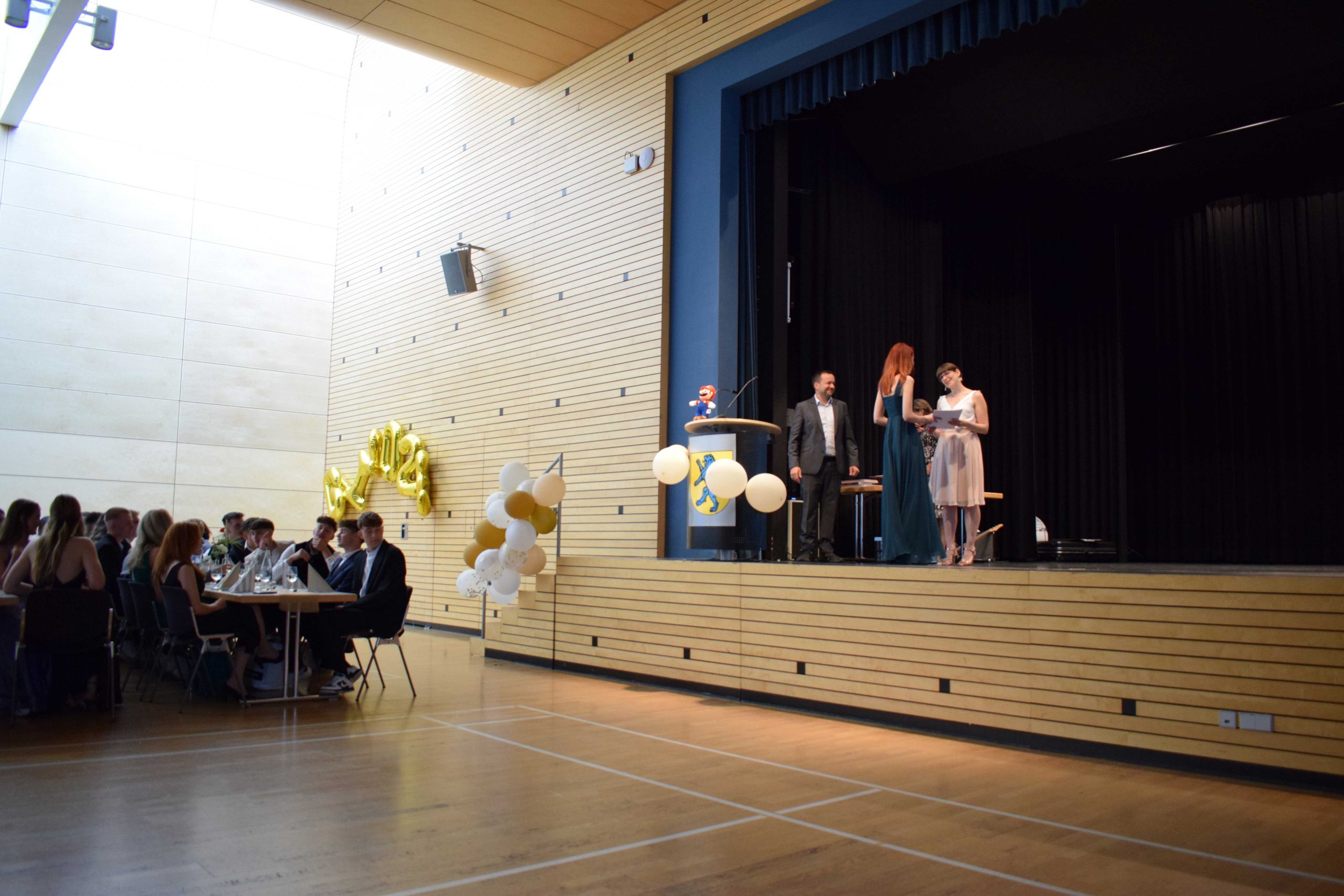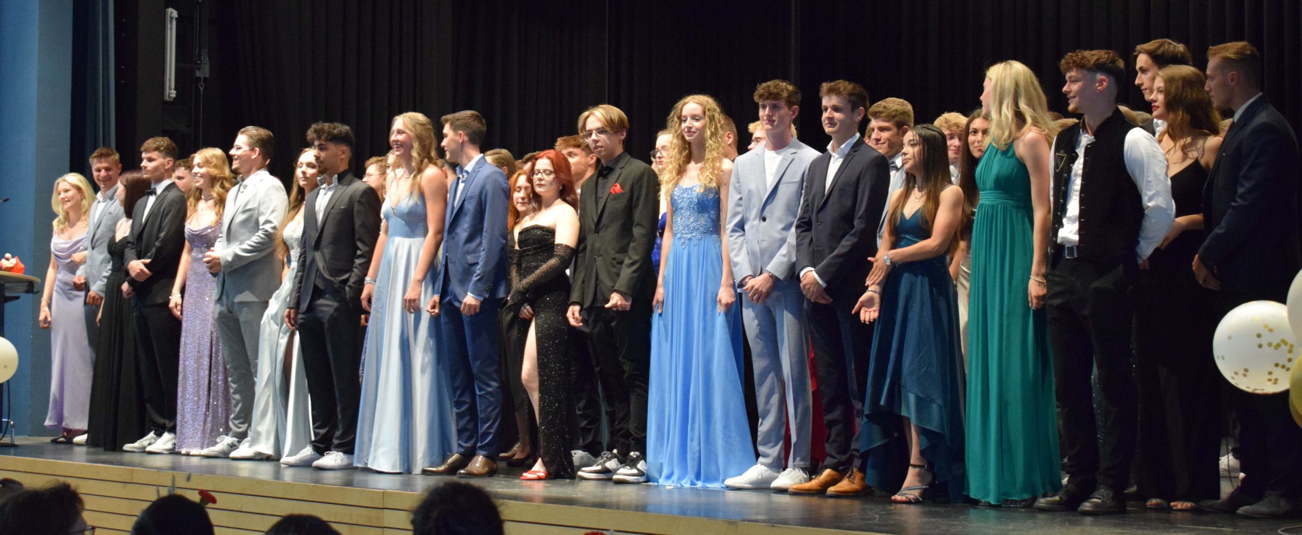 Stolz und fröhlich feierten 70 Schülerinnen und Schüler des Erich Kästner Gymnasiums Eislingen ihren Abschluss in der Salacher Stauferlandhalle. Vier Abiturienten erreichten die Traumnote von 1,0. Trotz der vielen Herausforderungen der vergangenen acht Jahre haben die Jugendlichen ihre Schulzeit gut gemeistert. Dazu gratulierten ihnen Schulleiter Stephan Arnold und die Oberstufenbetreuerin Meike Vollmer ganz besonders. Dass die Schule ein attraktives Musikprofil hat, bewiesen die Schülerinnen und Schüler mit mehreren Musikdarbietungen am Abiball. Auch in den Sprachen und Naturwissenschaften waren zahlreiche Erfolge zu verzeichnen, was die vielen Auszeichnungen zeigten.