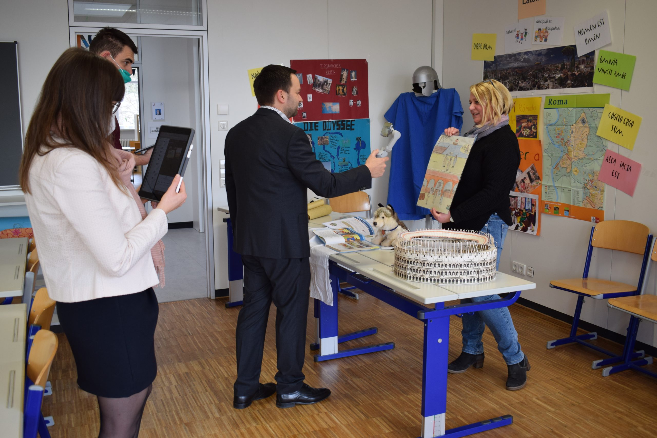 Das bunte Schulleben am Gymnasium konnten die Grundschüler der 4. Klasse in diesem Jahr bequem von zu Hause aus erkunden. Statt des Tags der offenen Tür streamte das Erich Kästner Gymnasium einen spannenden Rundgang durch die Schule. Wie kann ein Schokokuss aufgeblasen werden? Welche Experimente werden im Chemie-Unterricht gemacht? Wohin geht die Reise im Französischunterricht? Die Lehrerinnen und Lehrer zeigten das vielfältige Unterrichtsmaterial und erzählten von ihren Fächern, während Schulleiter Stephan Arnold den Rundgang durch die Schule filmte. Das Schulleitungsteam sorgte dafür, dass der Stream zuverlässig bei den Gästen zuhause ankam und Fragen der Kinder und Eltern beantwortet wurden. So konnte live erlebt werden, was das Erich Kästner Gymnasium seinen Schülerinnen und Schülern bietet: die Fahrzeuge der Roboter-AG und den 3-D-Drucker in Aktion, die Medienausstattung und die einladende Bibliothek, die vielfältigen Aktivitäten der Mittagsbetreuung und das Angebot der Schulsozialarbeit. Das Beratungsteam stellte das Programm „EKG- Es klappt gemeinsam“ vor, mit dem den neuen Fünftklässlern der Übergang durch eine positive, unterstützende Atmosphäre erleichtert wird. Die Musiklehrer machten während des Filmrundgangs mit ihrer Darbietung Lust auf das Musikprofil, im Biologieraum winkte das Schul-Skelett in die Kamera und in der Physik sorgten Blitze für Erleuchtung. Vor allem aber war so auch online die fröhliche und freundliche Atmosphäre in dem hellen, gut ausgestatteten Schulgebäude des Erich Kästner Gymnasiums spürbar.