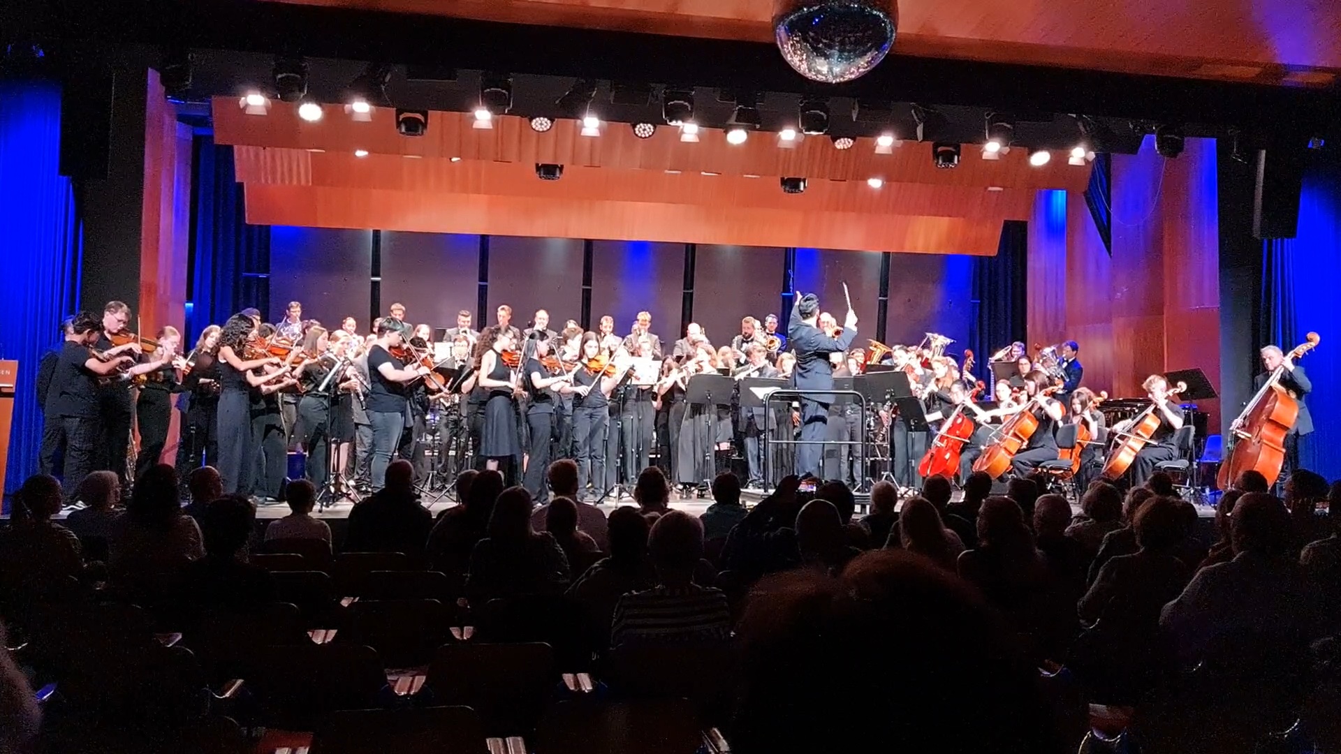 Während der Danksagung von Herrn Oberbürgermeister Heininger – er änderte übrigens im Laufe des Konzerts sein anfängliches Motto in „Berufs-Profi-Talente treffen Jugend-Profi-Talente!“ – und des Schulleiters Herrn Arnold versammelten sich alle Musiker auf der Bühne, um mit Johann Strauß‘ „Radetzky-Marsch“ das Konzert gemeinsam als großes Orchester zu beenden.