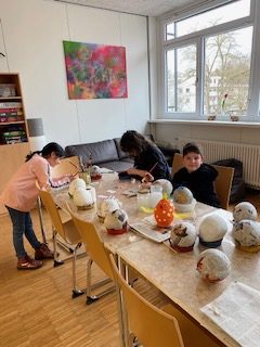Vögel einer ganz besonderen Art: Witzige große bunte Hühner in der Größe von Luftballons bastelten die Kinder der Ganztagsbetreuung in den Tagen vor den Osterferien.
