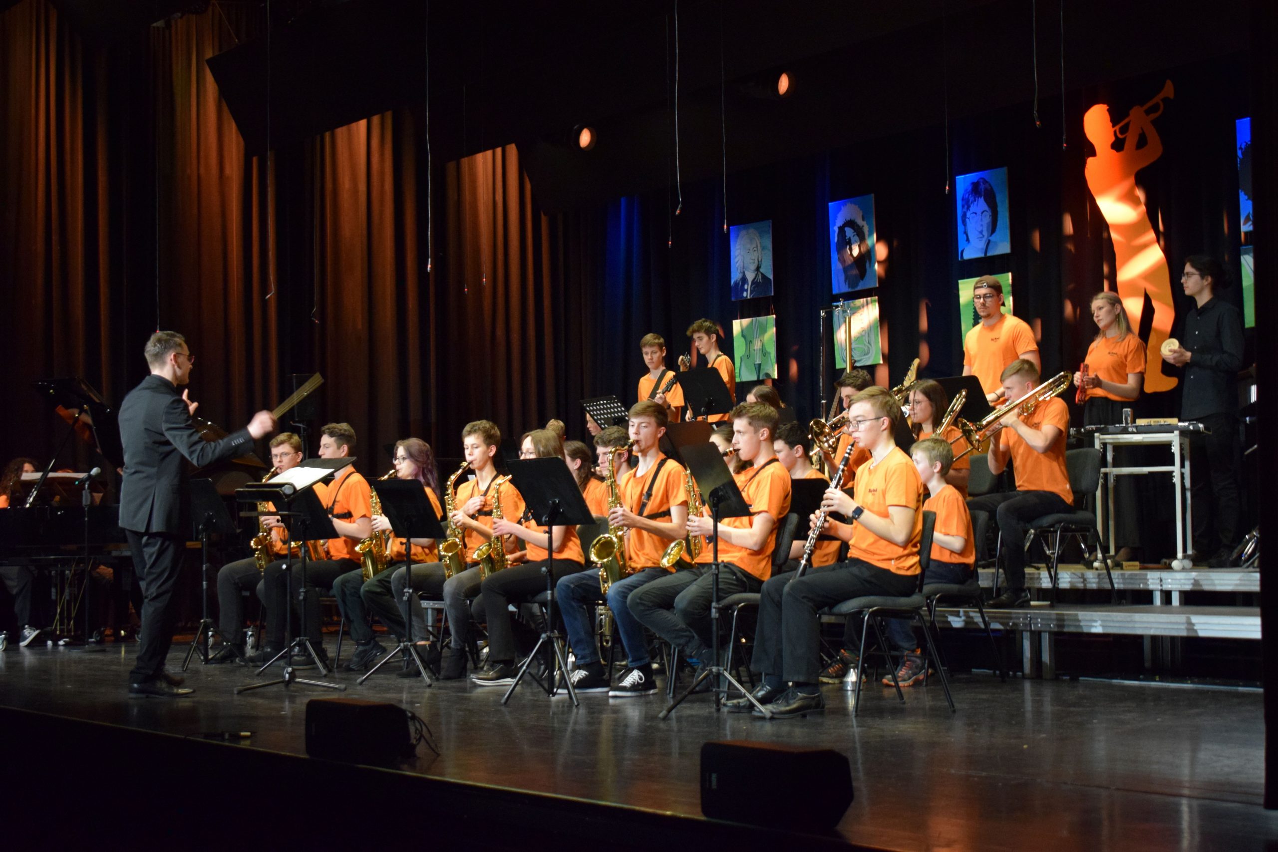 „Lassen sie sich verzaubern, berühren, entführen“, lud Schulleiter Stephan Arnold das Publikum in der zweimal ausverkauften Stadthalle ein. Im Laufe des Abends hielt es die Zuhörer dann kaum auf den Plätzen, wenn die heißen Rhythmen und die Begeisterung von der Bühne auf den ganzen Saal übersprangen. Vom Glück, wieder Musik machen zu dürfen, erzähle gleich zu Beginn der Unterstufenchor unter der Leitung von Corinna Gerlach: „There’s a little funny harmonie for you and me“. Der Oberstufenchor mit 40 Sängerinnen und Sängern, motiviert von Leiterin Annette Gander, legte dann nach. „And when you get the chance, you are the dancing queen“ sangen sie und ergriffen die Gelegenheit, mit ihrer temperamentvollen Performance die Herzen der Zuhörer zu erobern. Dass der Chor aber auch einfühlsam berühren kann, bewiesen die jungen Musiker mit afrikanischen Klängen des Gebetsgesangs „Baba Yetu“ mit Arman als Solisten. Auch das Kammermusik-Ensemble und die Percussion-Klasse der Schule vermittelten auf einfühlsame wie mitreißende Weise ihr Können. Wie sehr Musik beschwingt und Flügel verleiht, zeigten die Orchester der Schule. Die jungen Musiker des Unterstufenorchesters unter Leitung von Uta Oellig legten ihre Begeisterung in jeden Ton der Stücke vom Jive bis zum Blumenduett, stets bedacht auf ein stimmiges Zusammenspiel. Das Duett mit Julia und Julia brillierte dabei an der Querflöte. Gemütlich beschwingt begann das Oberstufenorchester unter Stephanie Kapfer mit Episoden aus der Filmmusik des „Dschungelbuches“. Darauf begeisterte das Ensemble mit einer atemberaubenden Darbietung von „The Lord of the dance“, das den Musikern in Tempo, Temperament und Zusammenspiel alles abverlangte. Die Zuhörer bedankten sich mit einem Beifallssturm. Auch die Bigband unter der Leitung von Martin Gradner heizte dem Publikum ein mit einem breiten Repertoire an schwungvollen Stücken, wobei „Africa“ besonders gut ankam. Fabian Sassmann, ehemaliger Schüler des EKG, übernahm zeitweise den Dirigentenstab, Mailin-Adia gab als Sängerin ihre Abschiedsvorstellung. Und zahlreiche Solisten an Trompete und Posaune bewiesen ihr Talent. Auch zehn ehemalige Schülerinnen und Schüler des EKG waren an diesem Abend im Einsatz, um die 150 aktiven Musiker der Schule aktiv zu unterstützen. Neben den wöchentlichen Proben hatten sich die Jugendlichen in einer sehr intensiven Musikwoche auf das Konzert vorbereitet. Der Aufwand hat sich gelohnt, die Freude an der Musik lag knisternd in der Luft. Am Ende waren die Musiker glücklich, wenn auch ausgepowert. Das Bühnenbild – von der Kunst-AG erstellte Portraits aktueller Musiklegenden – wurde von der Technik raffiniert ausgeleuchtet und trug so zur magischen Atmosphäre bei. In den Pausen kam es zum Wiedertreffen von aktiven und ehemaligen Schülern, Lehrern und Eltern. „Das war das beste Schulkonzert, das ich je erlebt habe,“ meinte Stefan Wünsche, ehemaliger langjähriger Lehrer am EKG, und mit diesem Kompliment war er nicht allein.