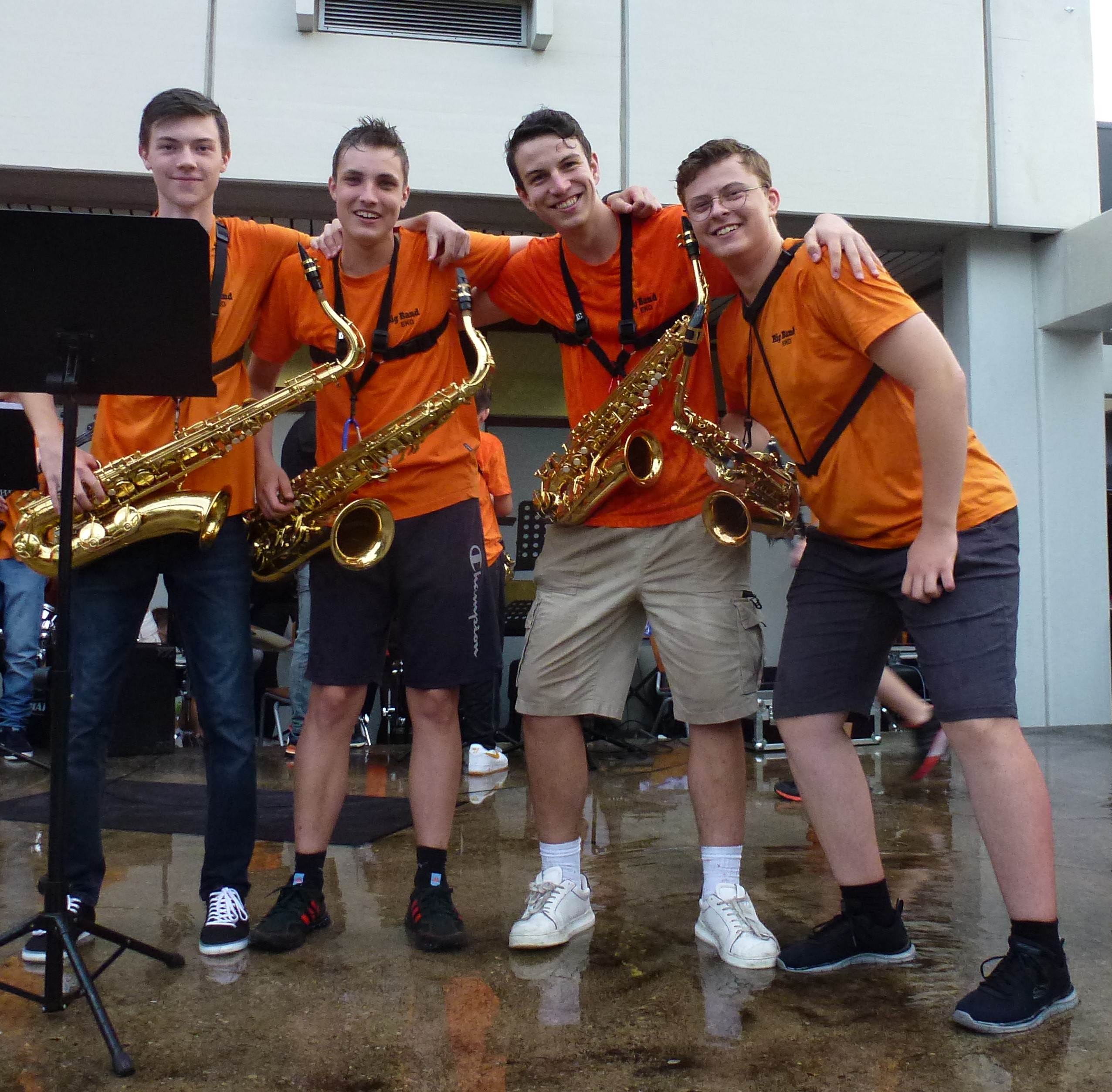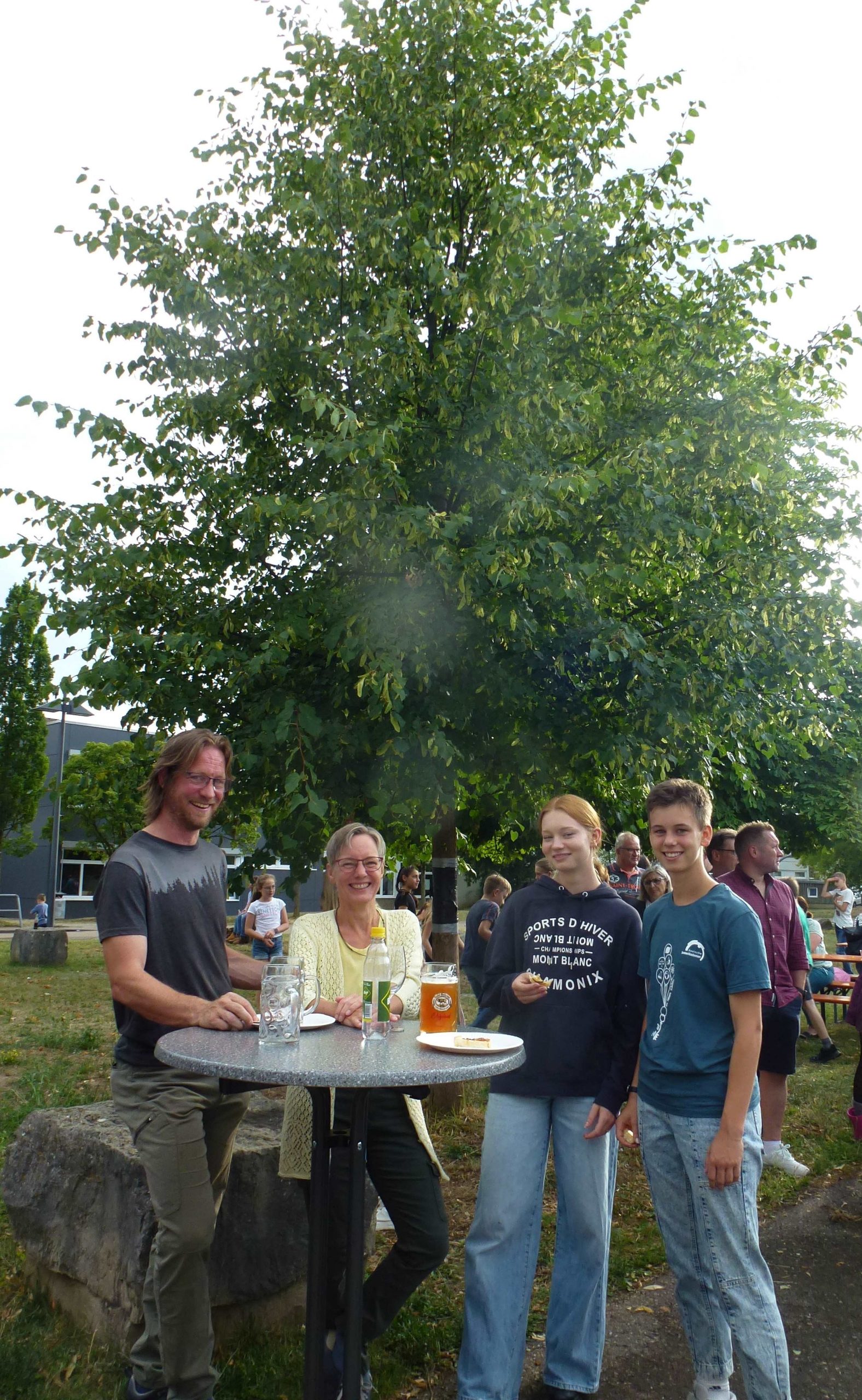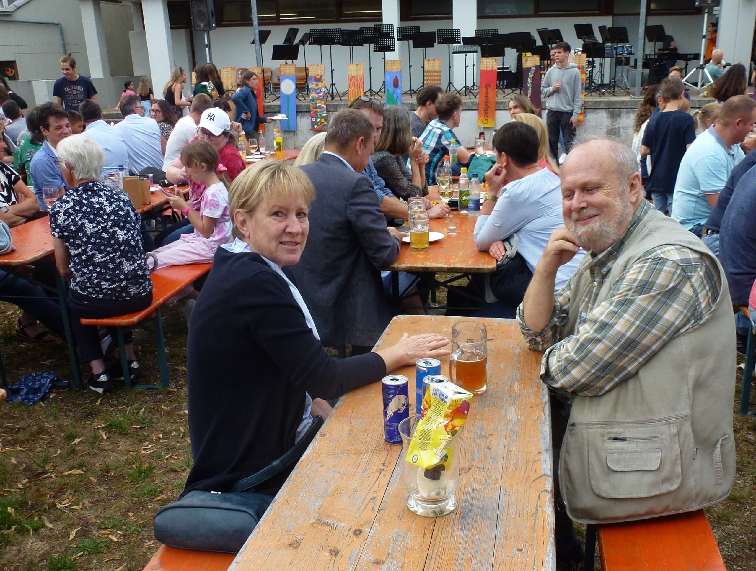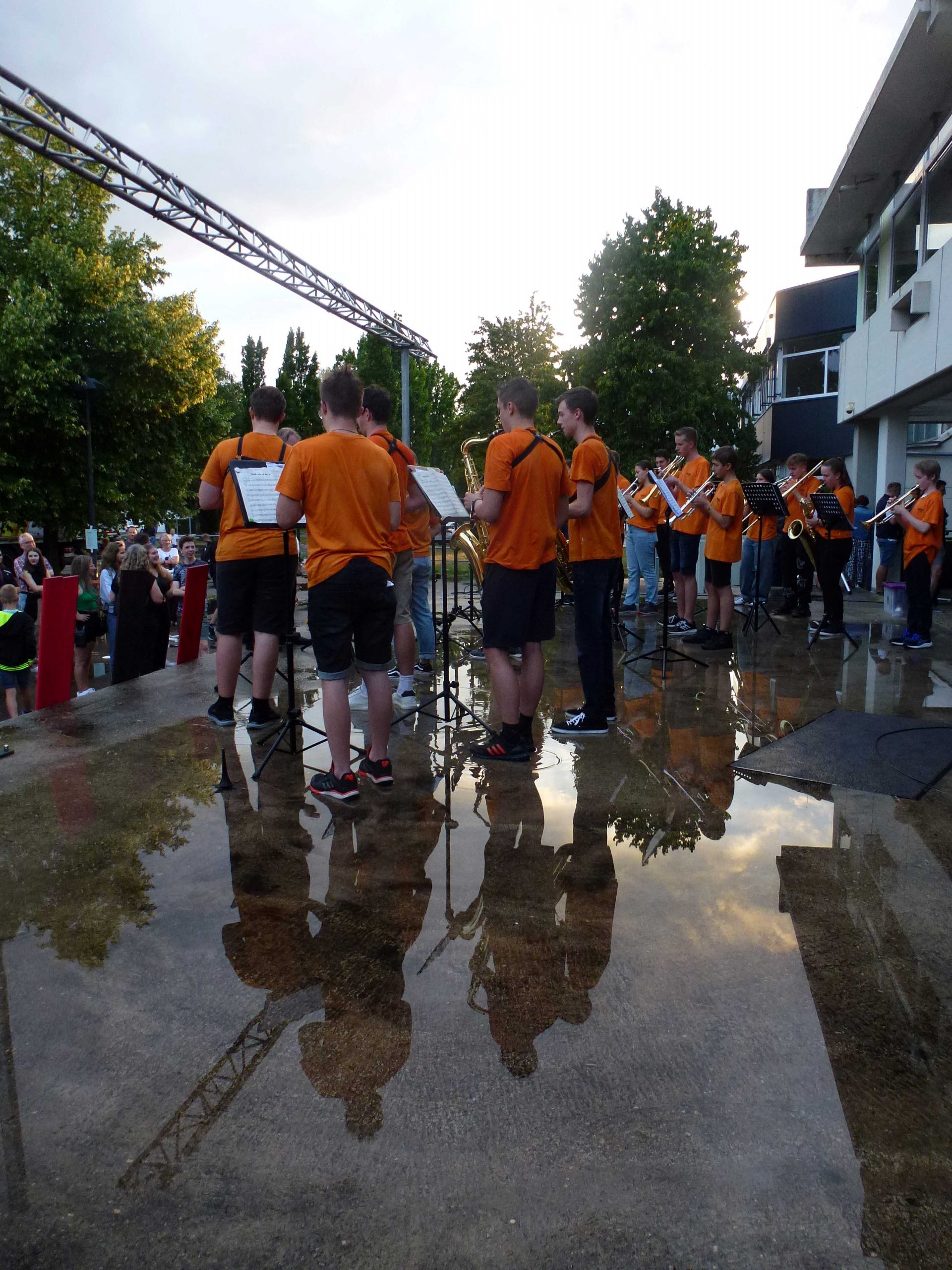 „Endlich wieder Schulfest!“ Die Sehnsucht danach war so groß, dass am EKG an diesem Abend wirklich volles Haus bzw. voller Schulhof herrschte. Viele Schülerinnen und Schüler, Eltern und Lehrer hatten sich zu einem fröhlichen Abend mit vielen netten Begegnungen eingefunden. Besonders viele ehemalige Schülerinnen und Schüler der letzten Jahrgänge waren aus allen Himmelsrichtungen angereist, um noch einmal die Schule zu besuchen und Mitschüler wie Lehrer zu treffen. Und so wurden am ganzen Abend nach Namen und Jahrgängen geknobelt und Erinnerungen ausgetauscht. Unterhalten wurden die Gäste vom Unterstufenorchester. Am späteren Abend sorgte die Bigband für gute Stimmung und ließ sich auch von einem heftigen Regenschauer am ansonsten sonnigen Abend nicht unterbrechen. Unermüdlich und mit Humor spielte die Band , auch als sie bis zu den Knöcheln im Wasser stand. Die verschiedenen Klassen hatten ein buntes Buffet zusammengestellt, viele Eltern, Schüler und Kollegen übernahmen Dienst-Schichten, so dass es für alle ein geselliger und unbeschwerter Abend wurde – außer für die drei Verantwortlichen Anna Bazle, Meike Vollmer und Martin Gradner, die unermüdlich und ohne Pause im Einsatz waren, um die perfekte Organisation des Festes zu stemmen. Herzlichen Dank an alle drei für diesen wunderbaren Abend!
