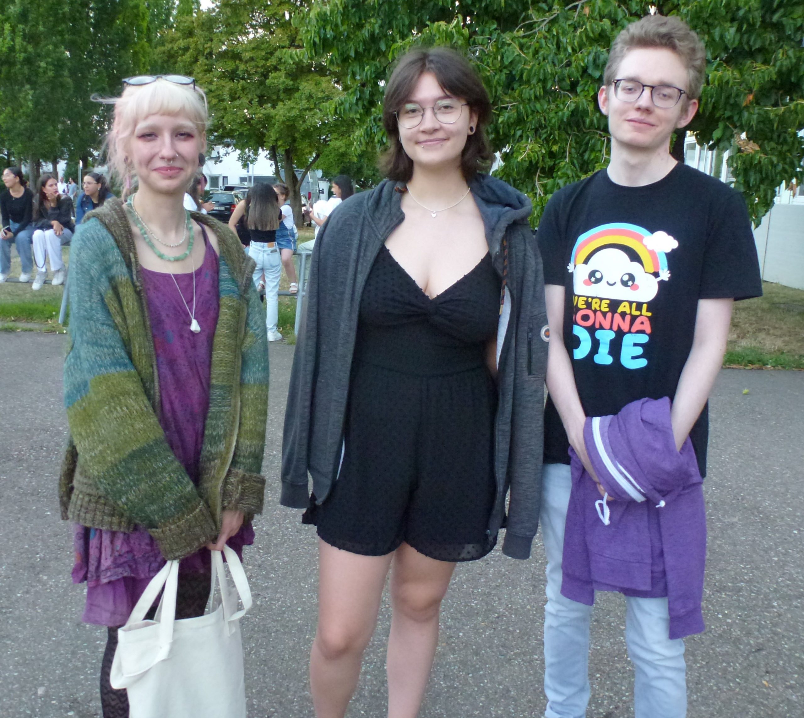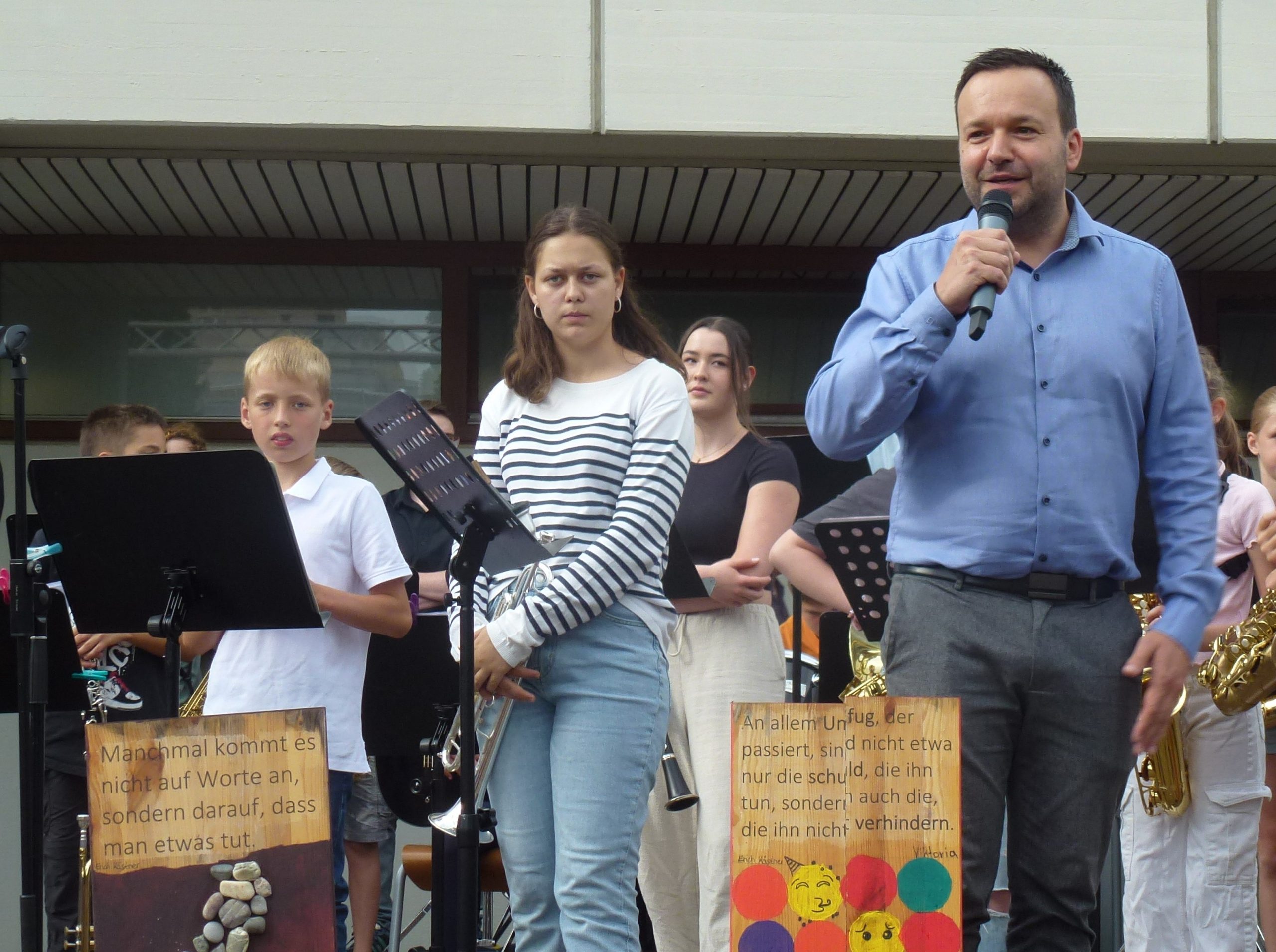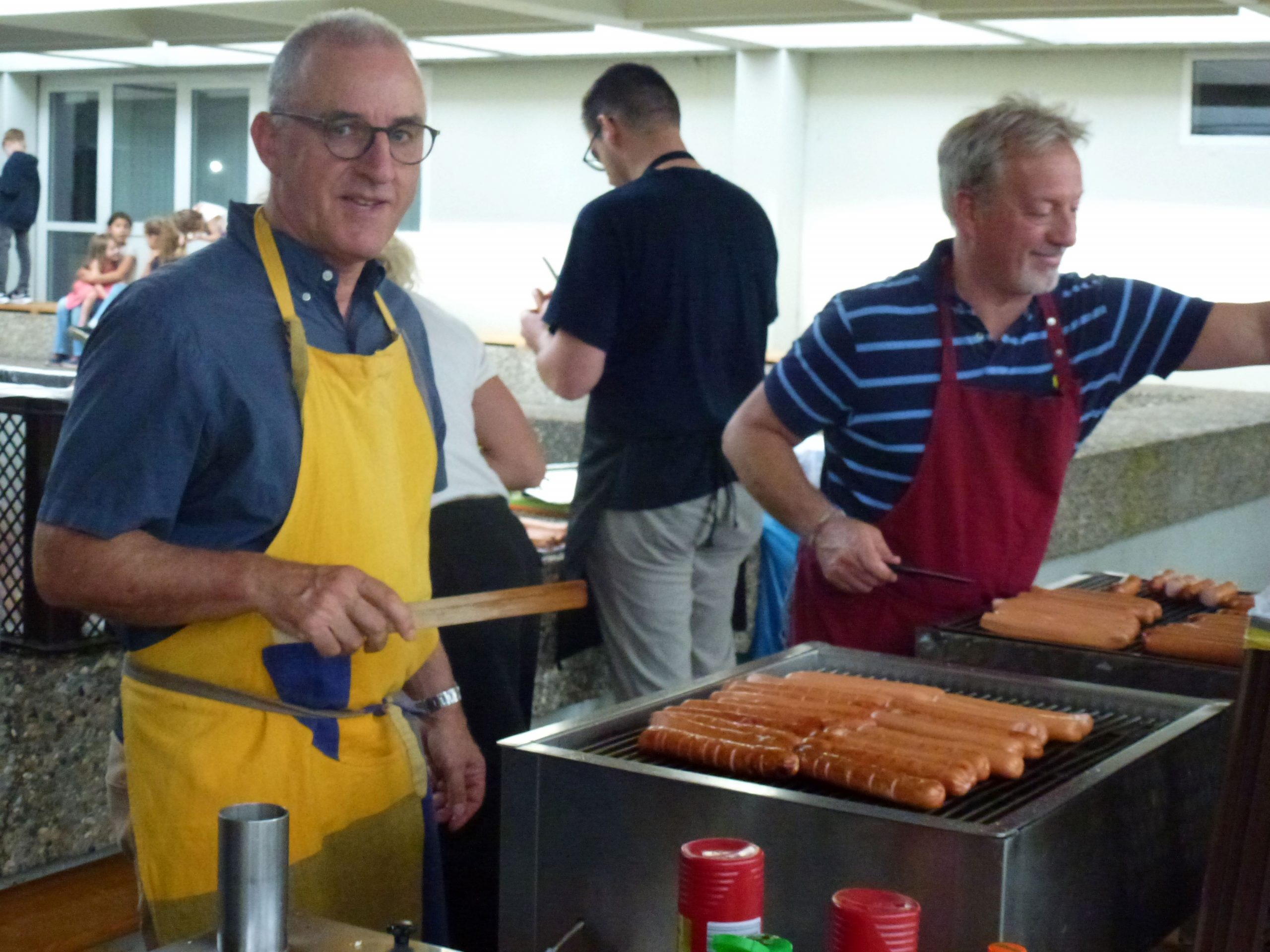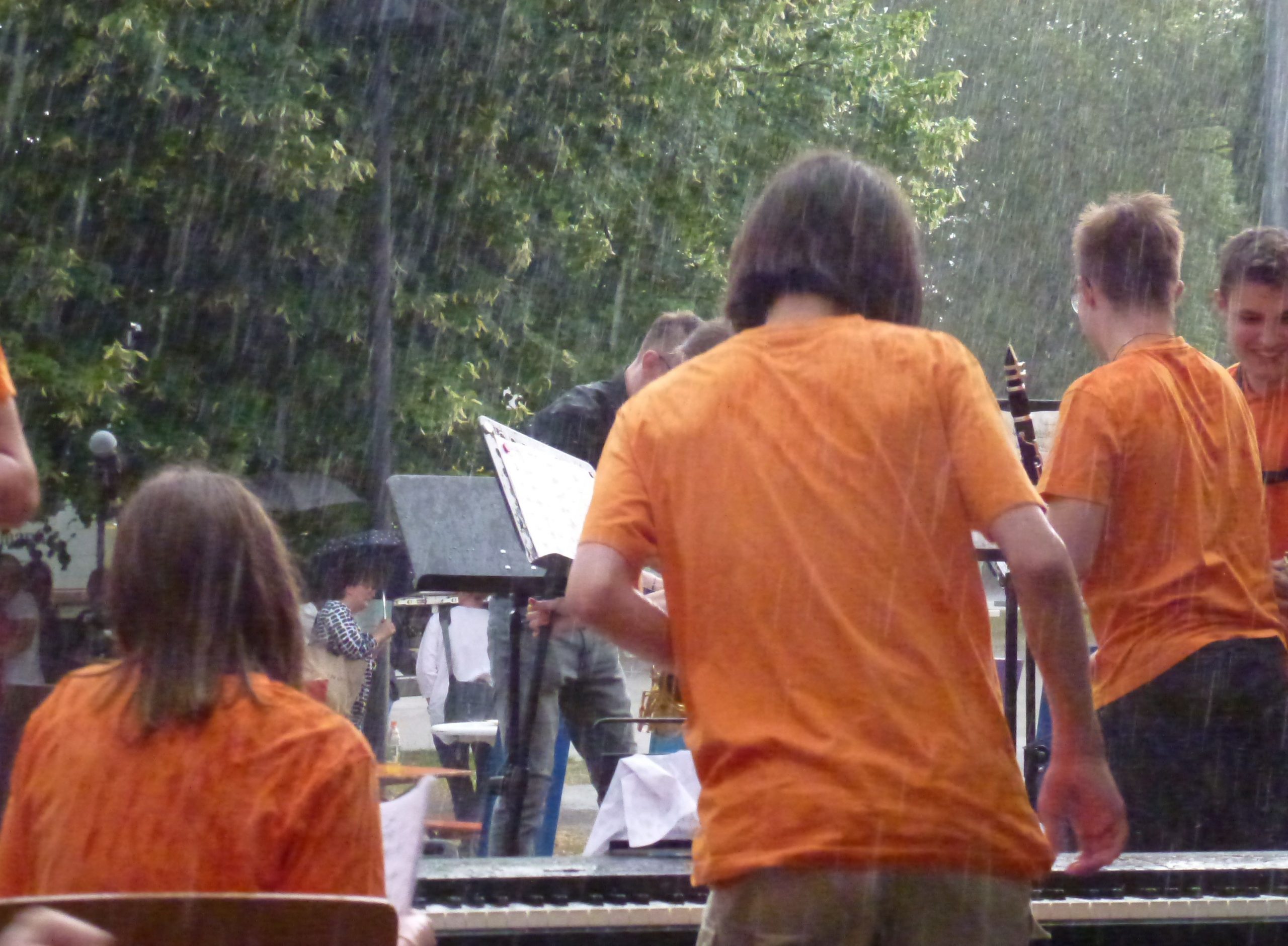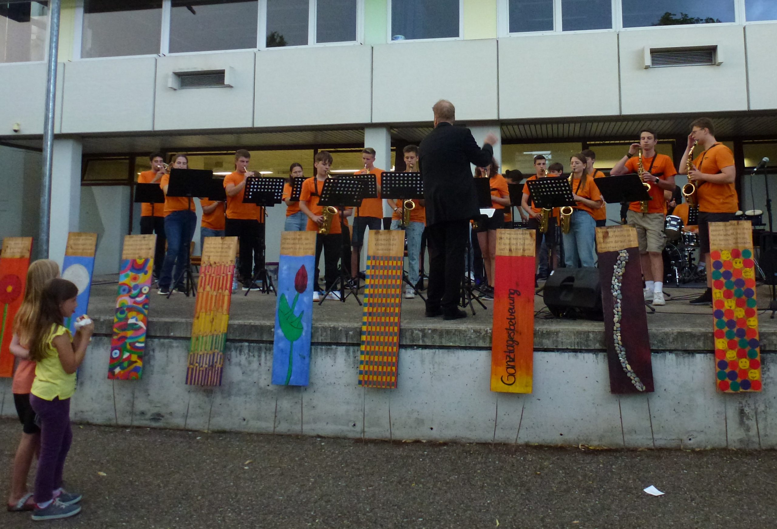 „Endlich wieder Schulfest!“ Die Sehnsucht danach war so groß, dass am EKG an diesem Abend wirklich volles Haus bzw. voller Schulhof herrschte. Viele Schülerinnen und Schüler, Eltern und Lehrer hatten sich zu einem fröhlichen Abend mit vielen netten Begegnungen eingefunden. Besonders viele ehemalige Schülerinnen und Schüler der letzten Jahrgänge waren aus allen Himmelsrichtungen angereist, um noch einmal die Schule zu besuchen und Mitschüler wie Lehrer zu treffen. Und so wurden am ganzen Abend nach Namen und Jahrgängen geknobelt und Erinnerungen ausgetauscht. Unterhalten wurden die Gäste vom Unterstufenorchester. Am späteren Abend sorgte die Bigband für gute Stimmung und ließ sich auch von einem heftigen Regenschauer am ansonsten sonnigen Abend nicht unterbrechen. Unermüdlich und mit Humor spielte die Band , auch als sie bis zu den Knöcheln im Wasser stand. Die verschiedenen Klassen hatten ein buntes Buffet zusammengestellt, viele Eltern, Schüler und Kollegen übernahmen Dienst-Schichten, so dass es für alle ein geselliger und unbeschwerter Abend wurde – außer für die drei Verantwortlichen Anna Bazle, Meike Vollmer und Martin Gradner, die unermüdlich und ohne Pause im Einsatz waren, um die perfekte Organisation des Festes zu stemmen. Herzlichen Dank an alle drei für diesen wunderbaren Abend!