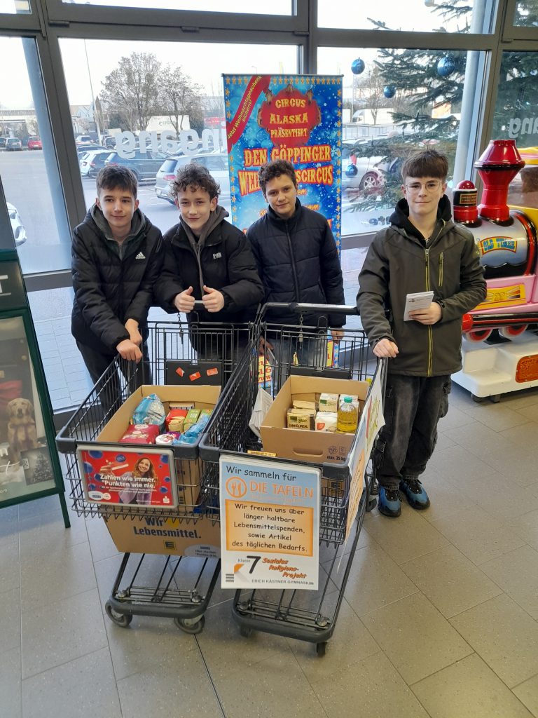 Es brauchte eine Menge Mut, was Oskar, Paolo, Lukas und Luka sich da trauten: Sie baten am Freitagnachmittag Kunden eines Supermarktes darum, zusätzliche Lebensmittel einzukaufen und in ihre Kiste für den Tafelladen zu legen. Von ihrem Erfolg waren die vier Schüler aus den 7. Klassen selbst überrascht. Körbeweise brachten Kunden ihnen Lebensmittel, sodass am Ende 10 große Einkaufskisten mit haltbaren Lebensmitteln gefüllt waren. Mit den Geldspenden kauften die Schüler am Ende selbst noch zusätzliche Drogerieartikel und Lebensmittel ein. In der nächsten Woche werden die Kisten dann zum Göppinger Tafelladen gebracht, wo die Lebensmittel an Familien verteilt werden, die sich aktuell kaum Essen leisten können. Die Aktion war ein Projekt, das im katholischen Religionsunterricht zum Thema “Soziale Gerechtigkeit” entstand.