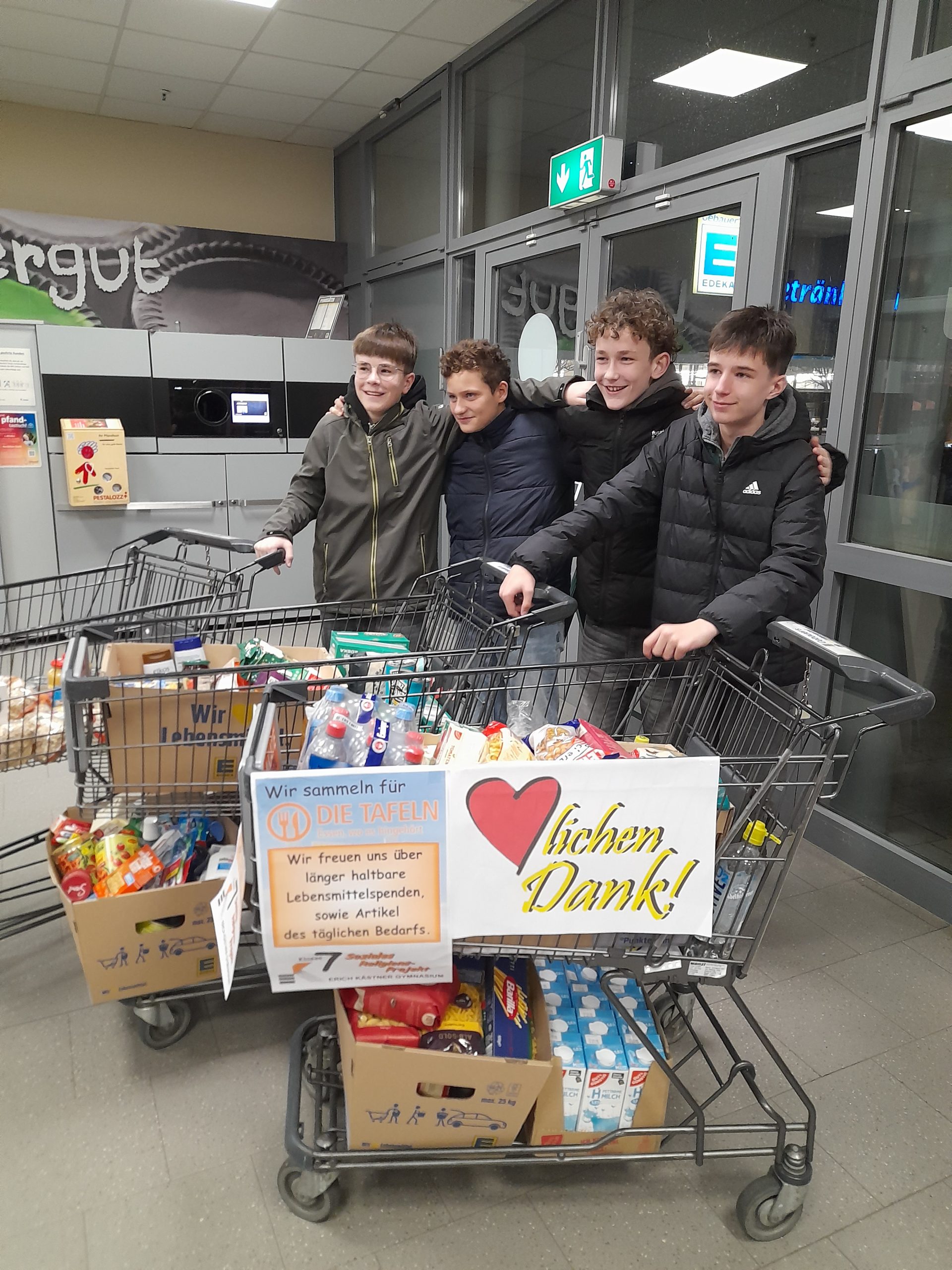 Es brauchte eine Menge Mut, was Oskar, Paolo, Lukas und Luka sich da trauten: Sie baten am Freitagnachmittag Kunden eines Supermarktes darum, zusätzliche Lebensmittel einzukaufen und in ihre Kiste für den Tafelladen zu legen. Von ihrem Erfolg waren die vier Schüler aus den 7. Klassen selbst überrascht. Körbeweise brachten Kunden ihnen Lebensmittel, sodass am Ende 10 große Einkaufskisten mit haltbaren Lebensmitteln gefüllt waren. Mit den Geldspenden kauften die Schüler am Ende selbst noch zusätzliche Drogerieartikel und Lebensmittel ein. In der nächsten Woche werden die Kisten dann zum Göppinger Tafelladen gebracht, wo die Lebensmittel an Familien verteilt werden, die sich aktuell kaum Essen leisten können. Die Aktion war ein Projekt, das im katholischen Religionsunterricht zum Thema “Soziale Gerechtigkeit” entstand.