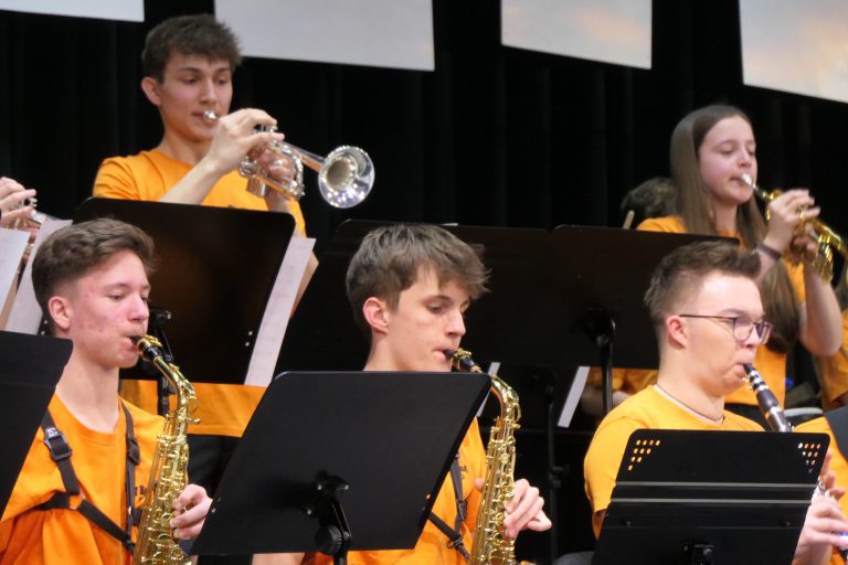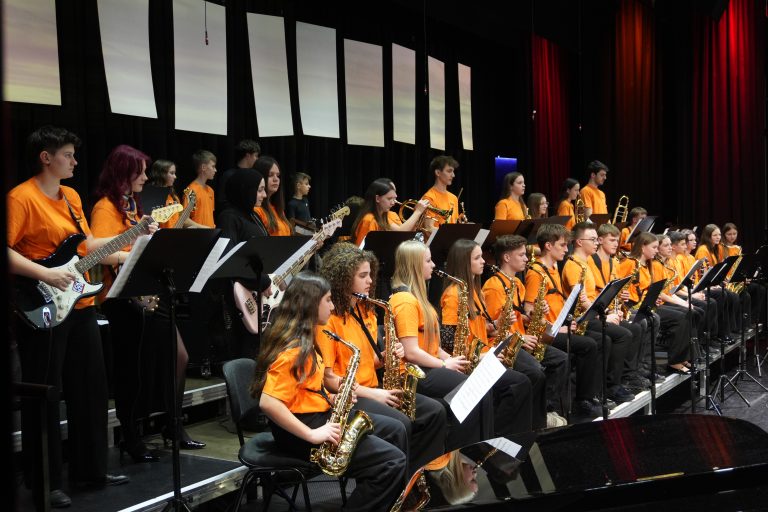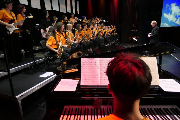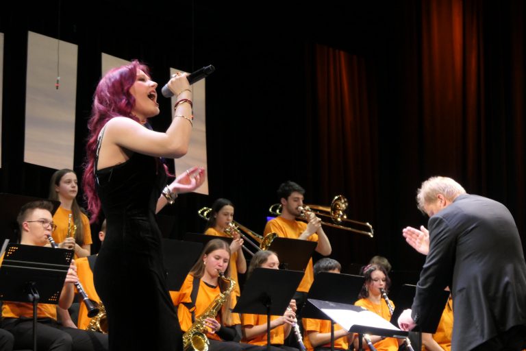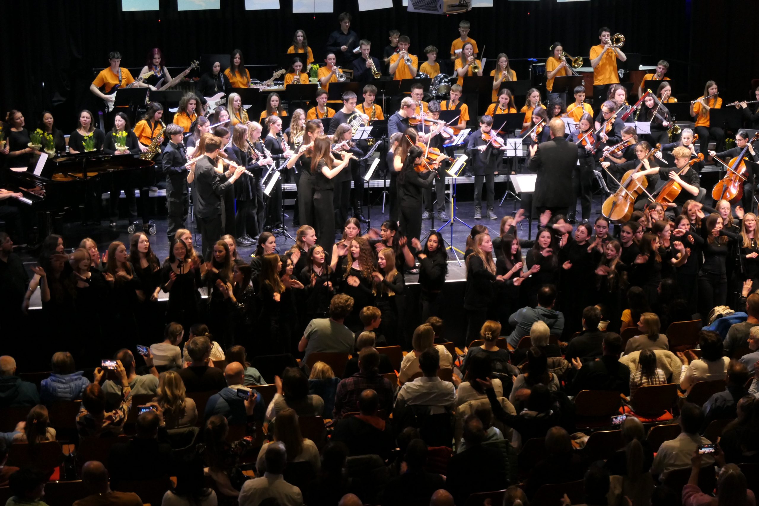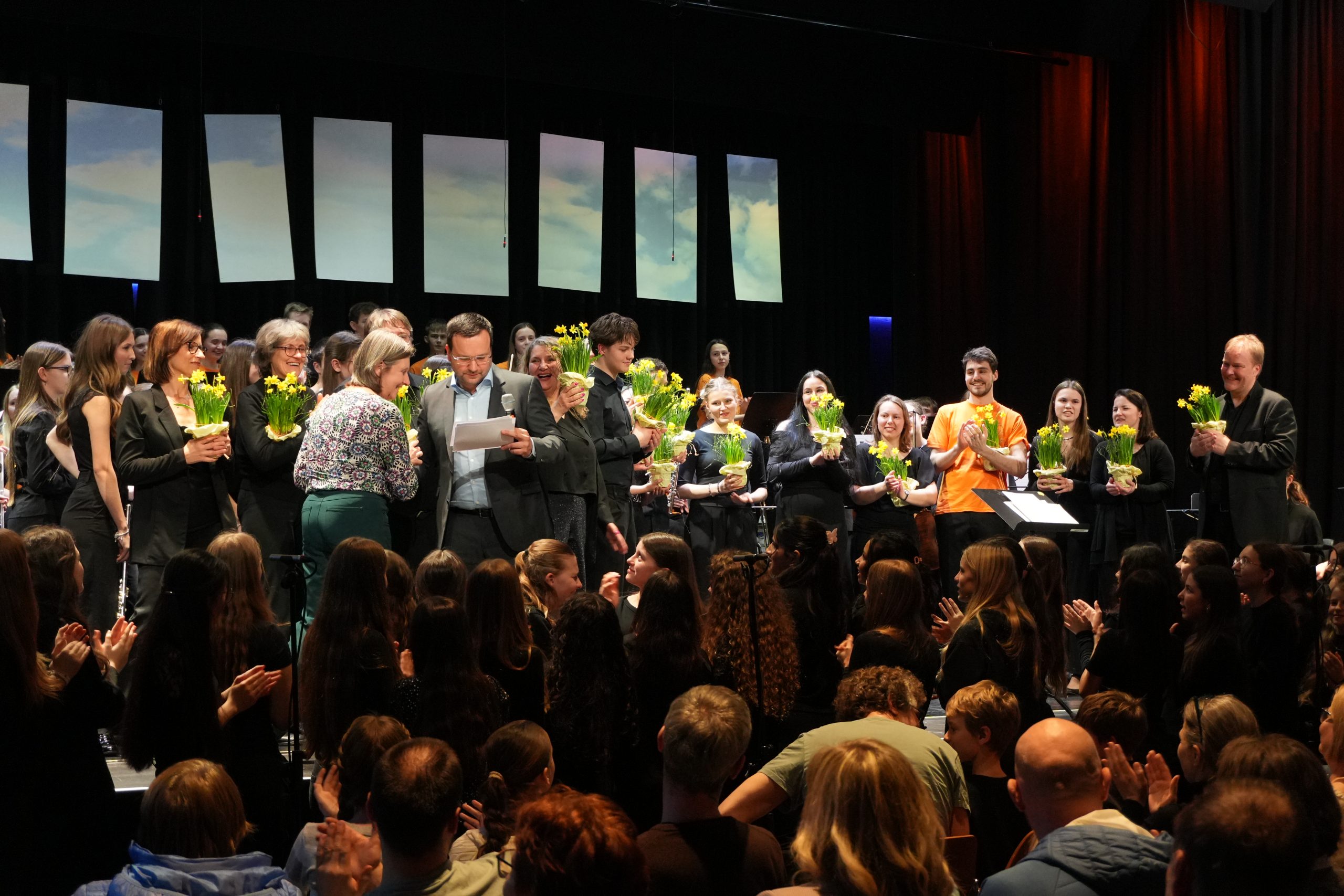 Beim großen Schlussfinale der beteiligten Ensembles, die dann endgültig nicht mehr alle auf die Bühne passten, gab es kein Halten mehr. Mit dem Sound von „Völlig losgelöst von der Erde“ beamten die Jugendlichen das Publikum in kosmische Sphären. Die Zuschauer dankten für den grandiosen Abend mit minutenlangem, stehendem Applaus und zollten den jungen Künstlern damit die verdiente Anerkennung für eine großartige Leistung. Auch Schulleiter Stephan Armold zeigte sich bei der Danksagung an alle Beteiligten begeistert. Zum Erfolg haben nicht nur die Musiklehrerinnen und Lehrer der Schule beigetragen, sondern auch ein duzend ehemalige Schülerinnen und Schüler, die der Schule treu bleiben und sowohl bei der Musikwoche in Ochsenhausen als auch beim Konzert im Einsatz waren. Die längste Tradition hält Markus Zimpel aufrecht, der seit 2004 den Chor am Klavier begleitet. Möglich wurde das Konzert auch durch die engagierte vielseitige Unterstützung der Stadt Eislingen, an diesem Abend auch durch das tatkräftige Team der Stadthalle. Ein besonderer Dank ging an Oberbürgermeister Klaus Heininger, der bei „seinem“ letzten Konzert symbolisch mit einer großen Konzertkarte verabschiedet wurde, auf der alle Mitwirkenden unterschrieben hatten. Die Konzertabende haben bewiesen: Gute Musik braucht viel Können, aber sie macht einfach glücklich!