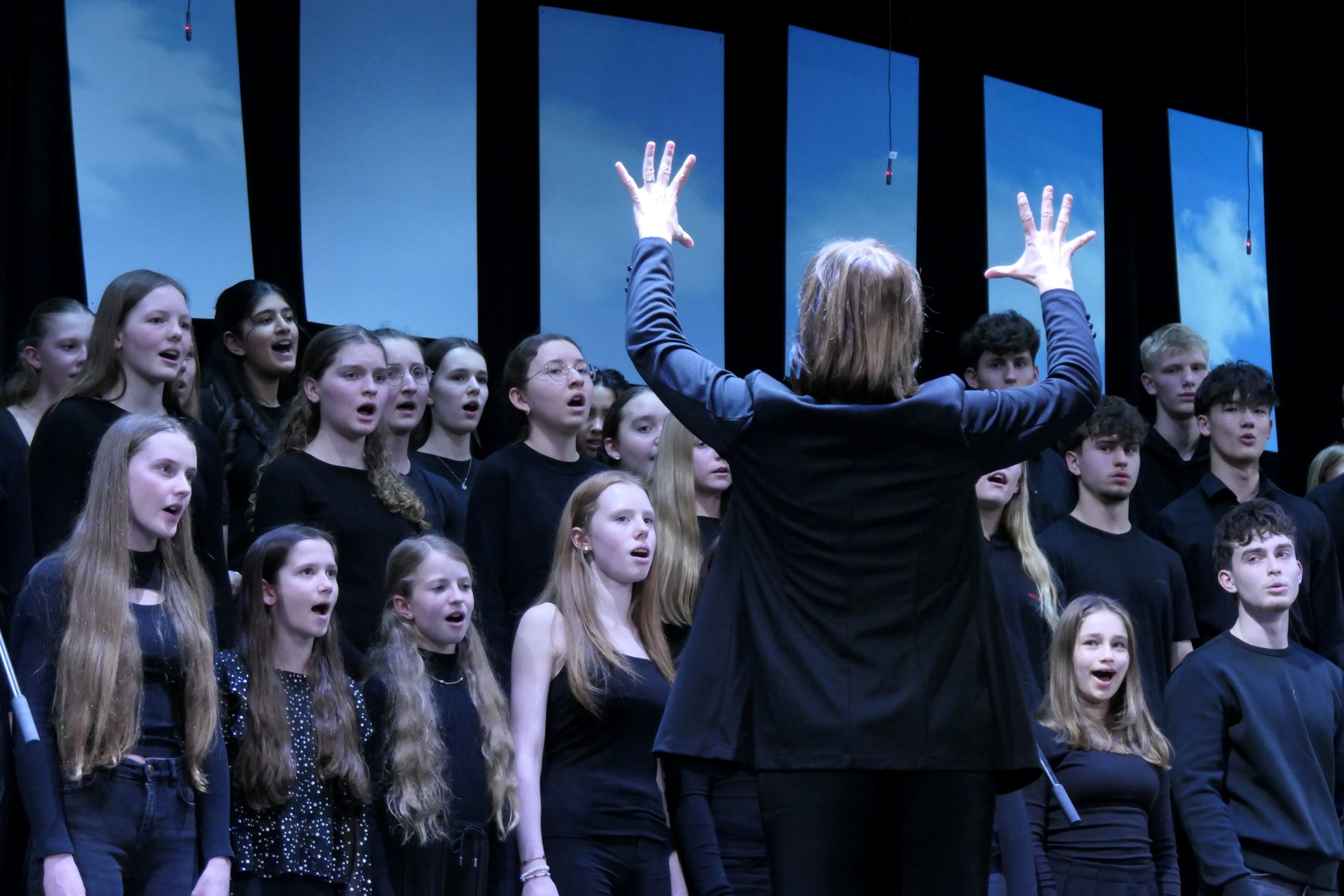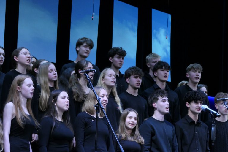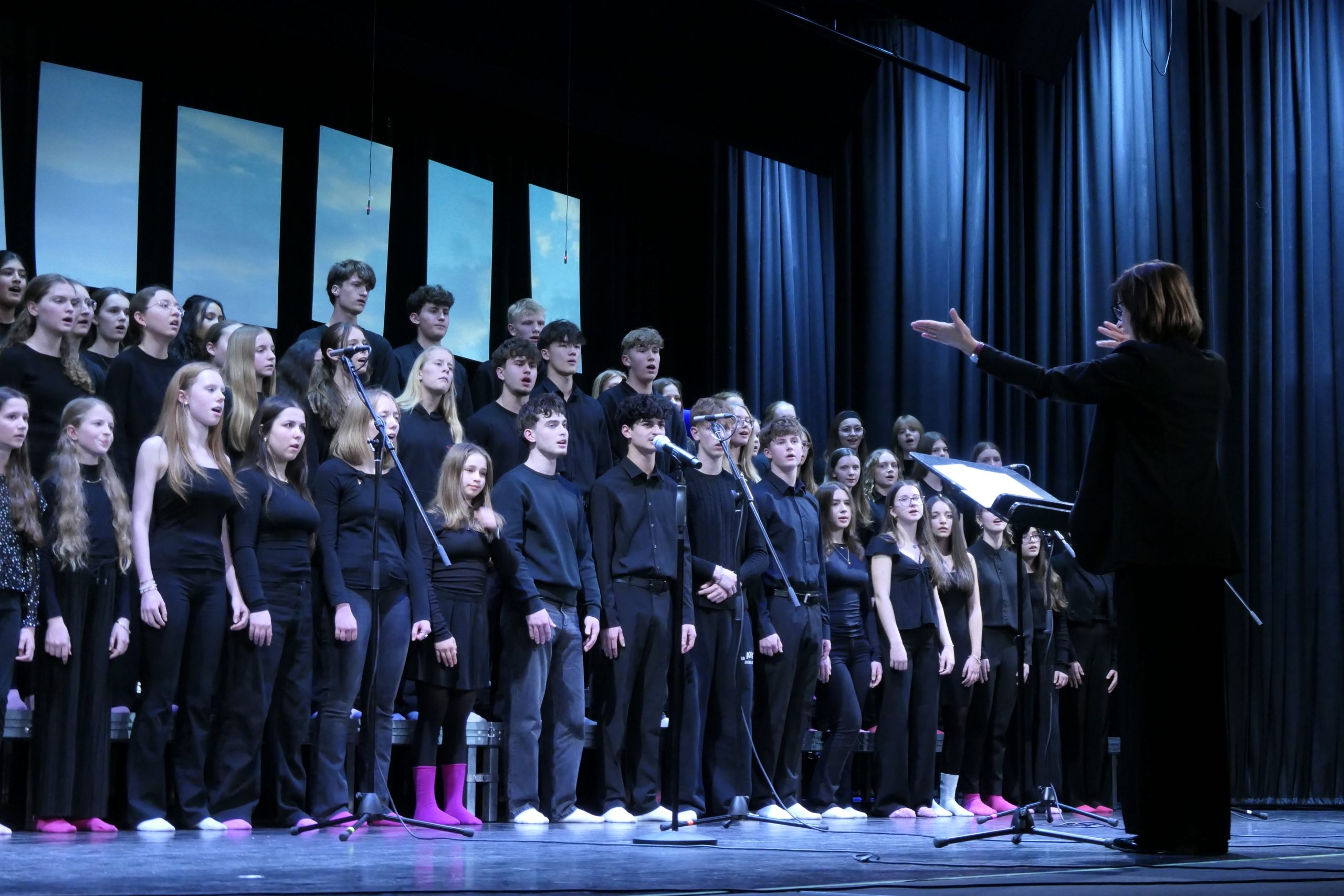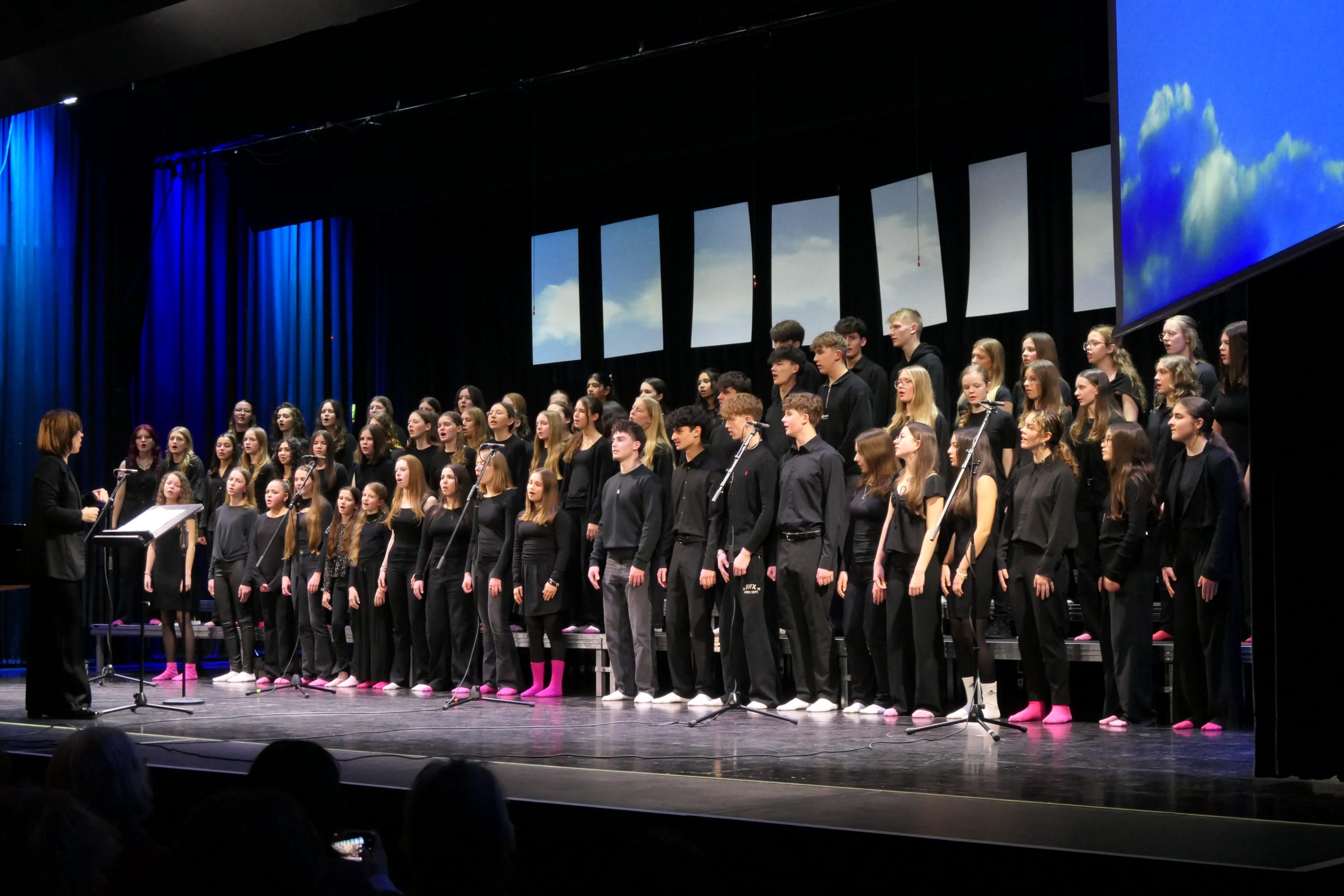 Schon das Bühnenbild, von Stefan Renner kreativ in Szene gesetzt, tauchte den Saal in ein stimmungsvolles himmlisches Licht mit unterschiedlichsten Wolkenformationen. Die musikalischen Darbietungen vertonten Szenarien zwischen Sky und Heaven, zwischen Sonne, Sternen und himmlischen Gefühlen. So zauberte der Unterstufenchor unter Corinna Gerlach ein Feuerwerk des Lebens in den Abend und holte mit klangvollen Stimmen Sterne des Glückes in den Saal. Die ganze Bandbreite himmlischer musikalischer Stimmungen erkundete der Oberstufenchor. Annette Gander hatte vier Lieder ausgewählt, sie reichten vom archaischen Klang eines Lied der nordischen Samen bis zum Song der Gruppe Silbermond, der für das Publikum den Himmel aufriss. 70 Jugendliche, darunter 20 Neuzugänge, lebten ihre Begeisterung für die Musik und bewiesen ihr musikalisches Feingefühl. So standen sie mit ihren traditionell pinkfarbenen Socken als eine unverbrüchliche Gemeinschaft auf der Bühne.