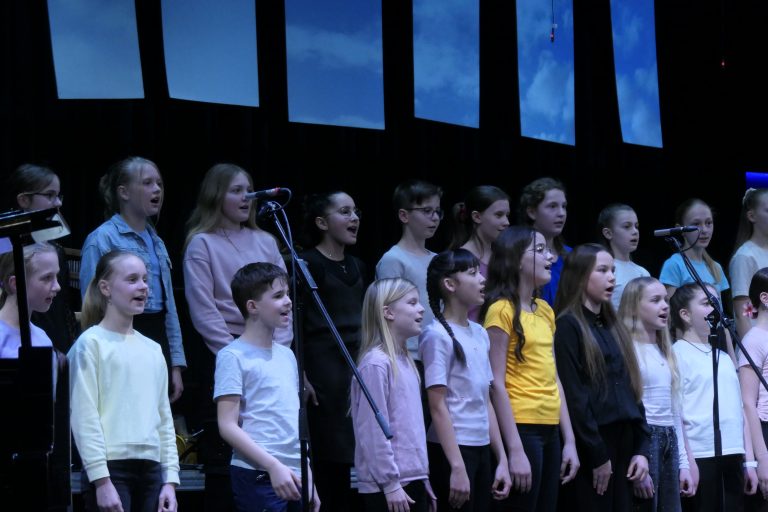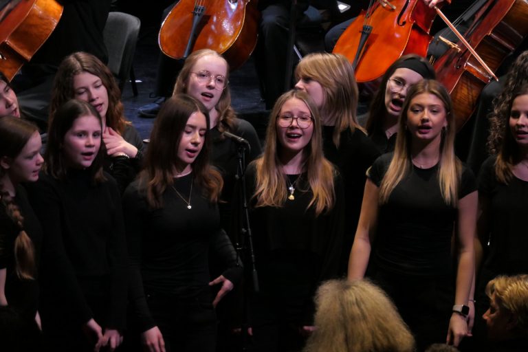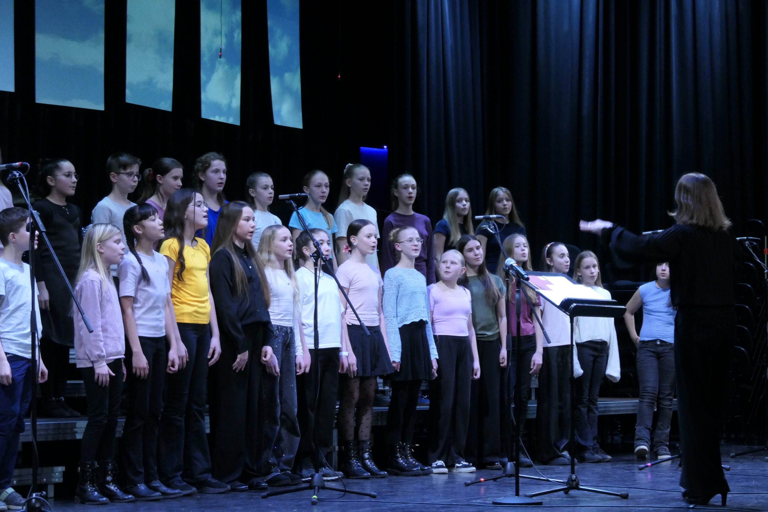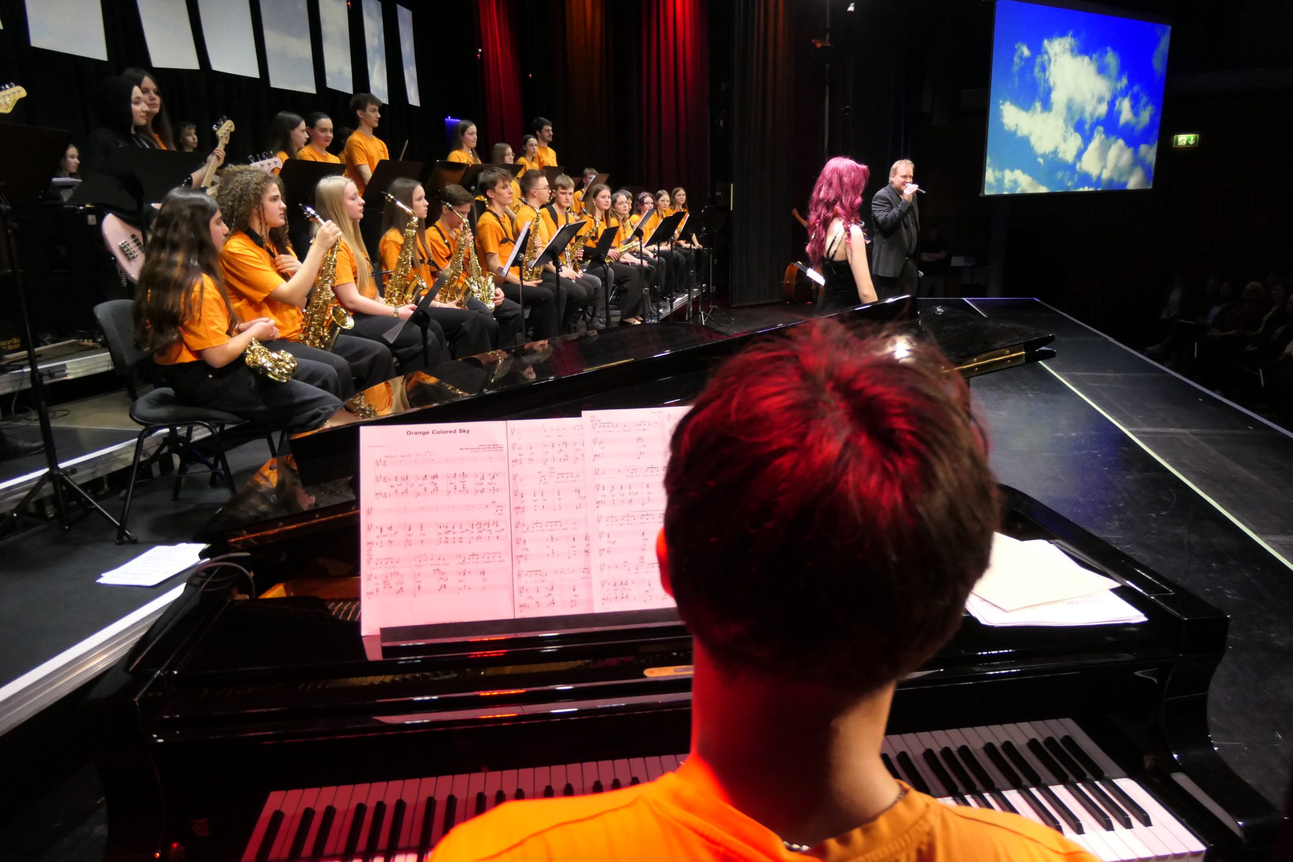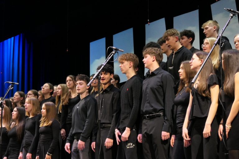 Schon das Bühnenbild, von Stefan Renner kreativ in Szene gesetzt, tauchte den Saal in ein stimmungsvolles himmlisches Licht mit unterschiedlichsten Wolkenformationen. Die musikalischen Darbietungen vertonten Szenarien zwischen Sky und Heaven, zwischen Sonne, Sternen und himmlischen Gefühlen. So zauberte der Unterstufenchor unter Corinna Gerlach ein Feuerwerk des Lebens in den Abend und holte mit klangvollen Stimmen Sterne des Glückes in den Saal. Die ganze Bandbreite himmlischer musikalischer Stimmungen erkundete der Oberstufenchor. Annette Gander hatte vier Lieder ausgewählt, sie reichten vom archaischen Klang eines Lied der nordischen Samen bis zum Song der Gruppe Silbermond, der für das Publikum den Himmel aufriss. 70 Jugendliche, darunter 20 Neuzugänge, lebten ihre Begeisterung für die Musik und bewiesen ihr musikalisches Feingefühl. So standen sie mit ihren traditionell pinkfarbenen Socken als eine unverbrüchliche Gemeinschaft auf der Bühne.