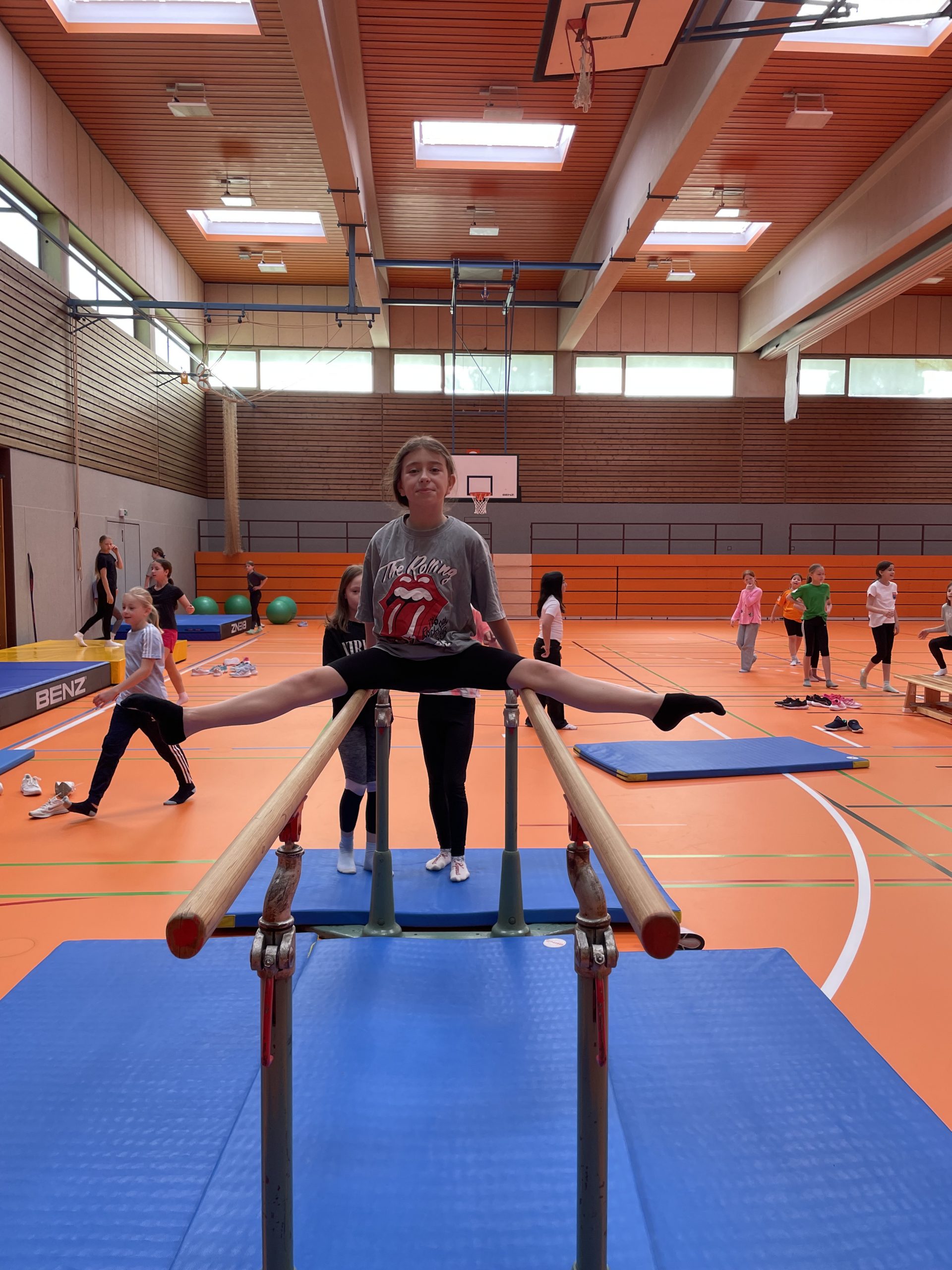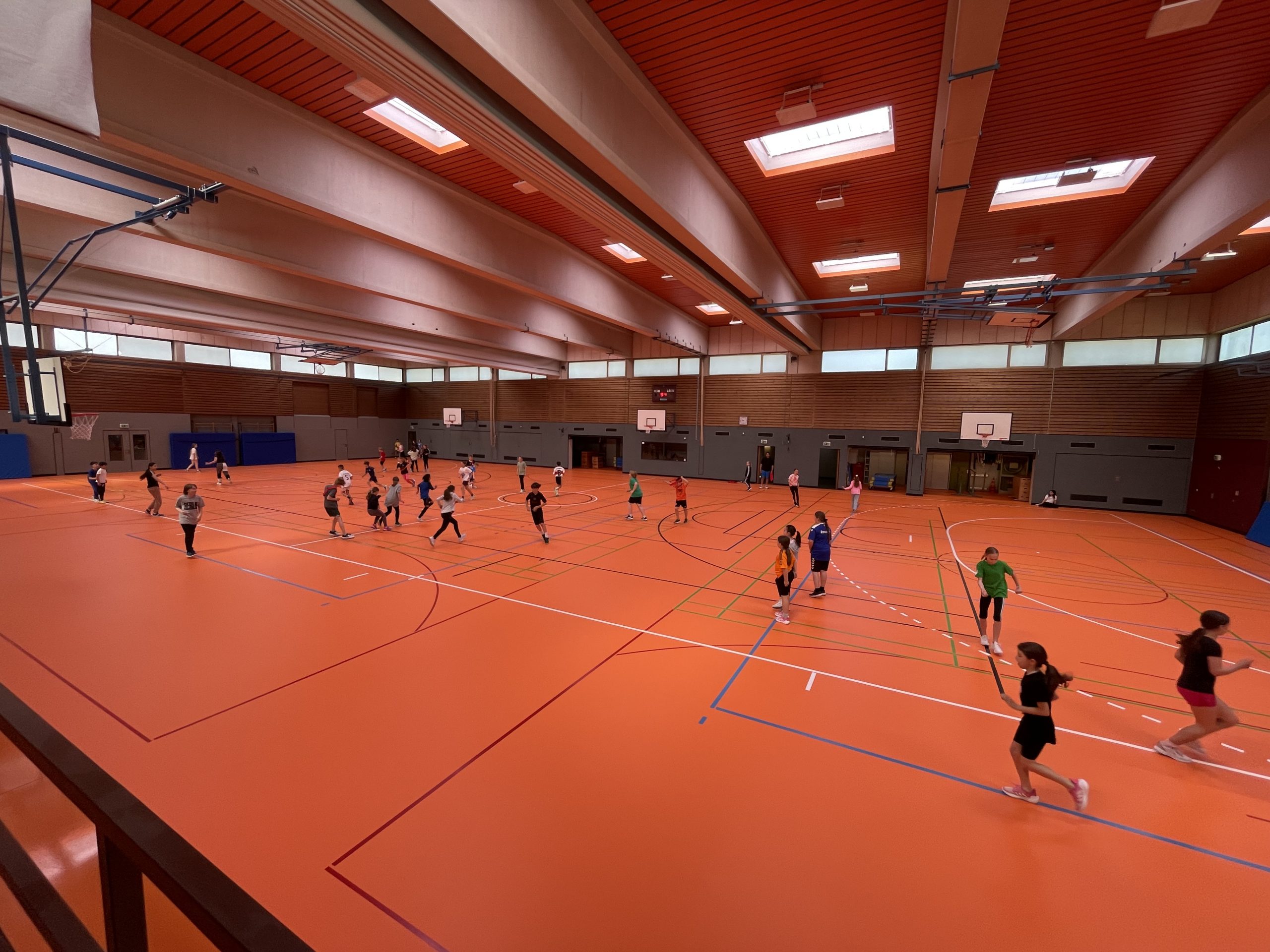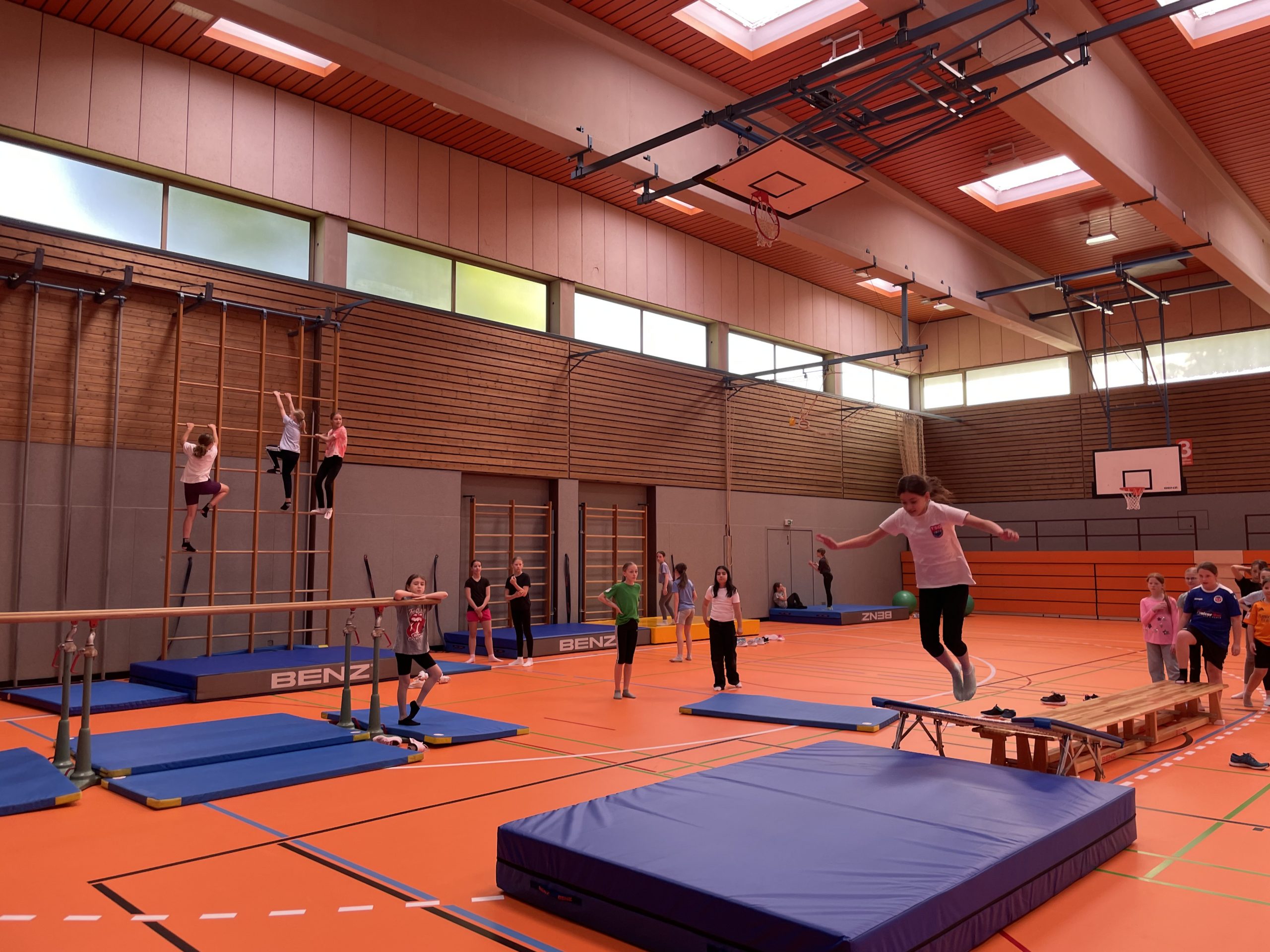 Mit Freudensprünge und Saltos wurde die renovierte Turnhalle Ösch 1 von Schülerinnen und Schülern des Erich Kästner Gymnasiums wieder in Betrieb genommen. Vor einem Jahr hatte die Krumm beim Hochwasser die Halle geflutet. Nach langer Bauzeit ist die Turnhalle nun wieder für den Schulsport und für Vereine freigegeben.