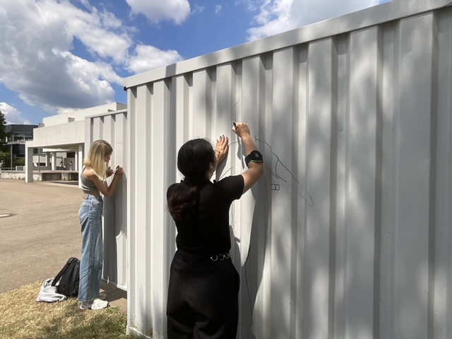 Im Rahmen der Ganztagsbetreuung haben Schülerinnen den grauen und unansehnlichen Schulcontainer in ein lebendiges Kunstwerk verwandelt. Mit kreativen Silhouetten in Schwarz brachten Melisa Tenlik und Lina Dengel den Container zum Strahlen. Die eindrucksvolle Teamarbeit von Victoria und Lina verlieh dem Kunstwerk den letzten Schliff. Das Projekt zeigt die erstaunliche künstlerische Begabung und das Engagement der Schülerinnen, die ihren Schulalltag mit ihrer kreativen Gestaltung bereichern.
