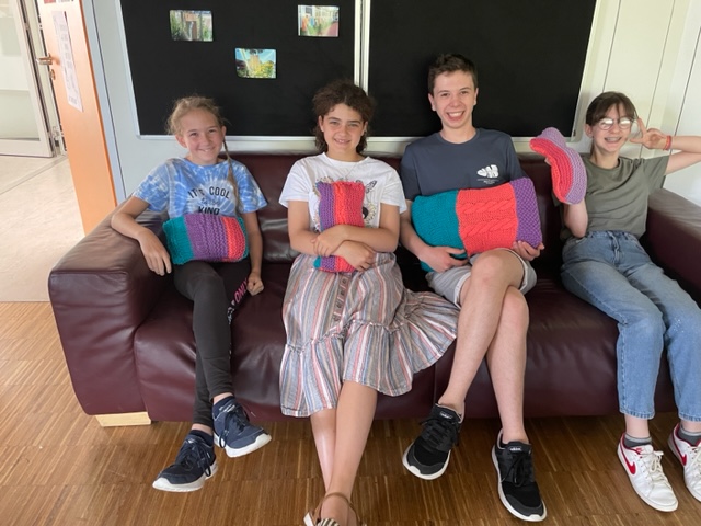 Auch die Strick-AG unter Jonas Nagl präsentierte am Ende des letzten Schuljahres stolz das Ergebnis ihrer Arbeit: bunte Sofakissen.