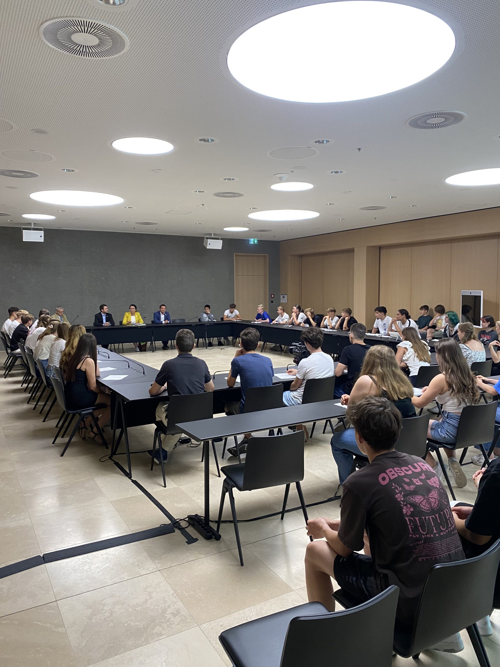 Zum Gespräch mit den Schülerinnen und Schülern fanden sich dann die Wahlkreisabgeordnete Ayla Cataltepe von Bündnis 90/Die Grünen sowie Dennis Birnstock von der FDP ein. Ihnen stellten die Jugendlichen ihre mitgebrachten Fragen zu G9, einem (sozialen) Pflichtjahr, zum Tempolimit oder zum Thema Migration. Auch diese Stunde verging wie im Fluge.