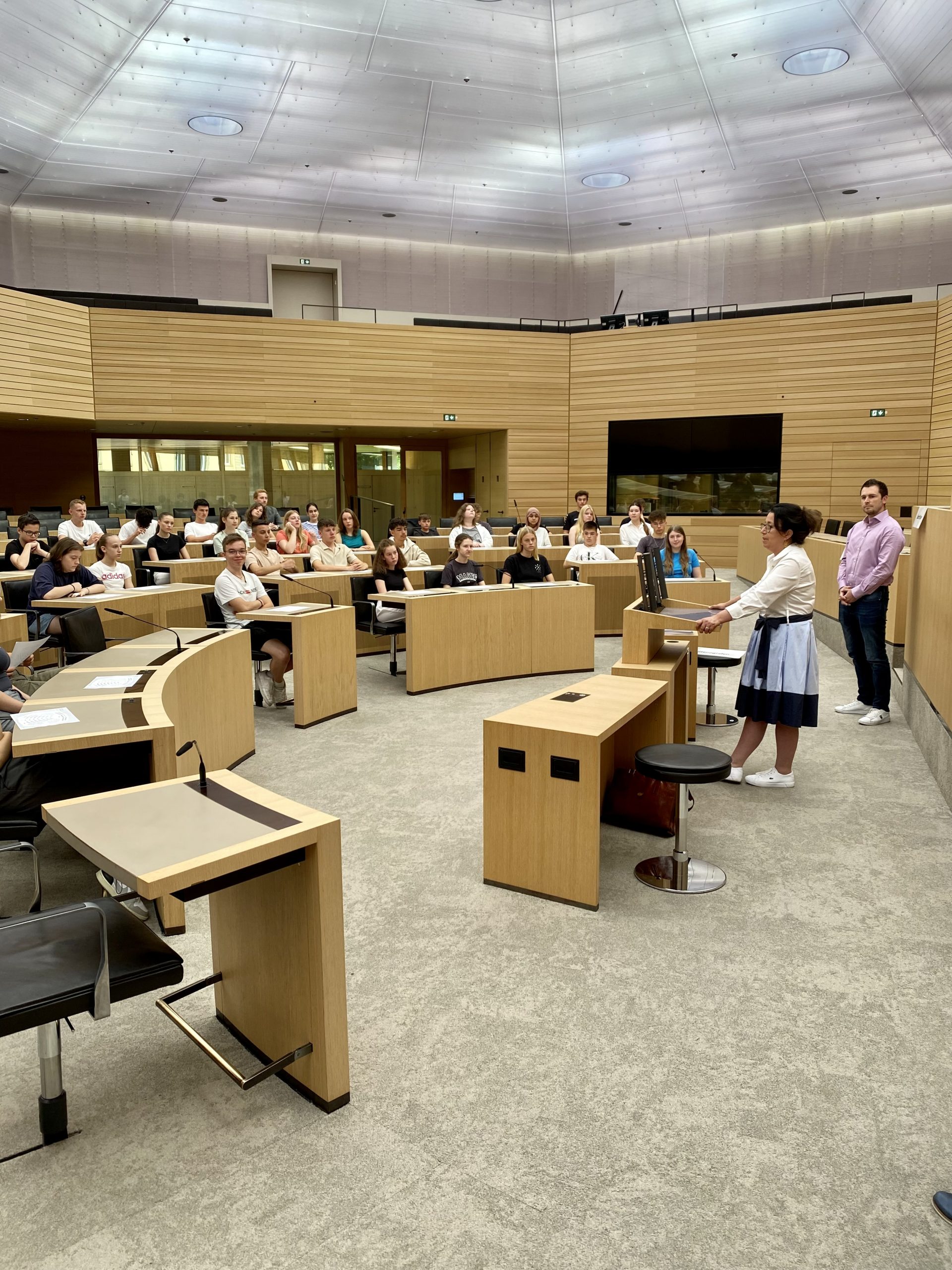 Zuerst erlebten die Zehntklässler*innen, denen ein Besuch pandemiebedingt bisher verwehrt geblieben war, eine Stunde im Plenarsaal, bei der es um einen Gesetzesentwurf der AfD ging. Dabei konnten die Schülerinnen und Schüler sehr exemplarisch die Dynamik während einer solchen Debatte erleben. Das anschließende Abgeordnetengespräch mit Vertreterinnen aus allen fünf Fraktionen fiel dann viel zu kurz aus, so dass leider einige Fragen offen blieben.