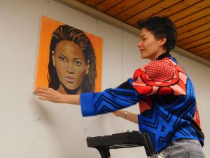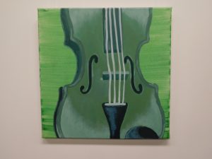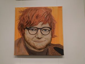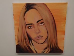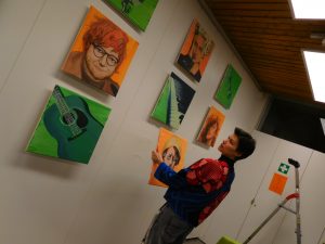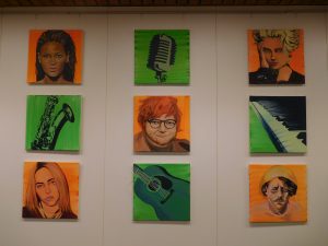 In Grün und Orange, den fröhlichen Hoffnungsfarben, leuchten die neuen Bilder im Aufenthaltsraum des Erich Kästner Gymnasiums. Und während davor lebhaft gekickert wird, kommen Schülerinnen und Schüler gesprungen und erklären die Bilder: „Das ist Ed Sheeran. Und das Billie Eilish!“ Kunstpädagogin Doris Vogel, die das Projekt angestoßen hat, freut sich. Sie hat ihr Ziel erreicht. Die Jugendlichen, die den Aufenthaltsraum nutzen, identifizieren sich mit ihren Stars, die nun in originellen Portraits von der Wand grüßen. Sie möchte, dass die Betrachter miteinander ins Gespräch kommen über ihre Lieblingsmusik und deren Interpreten. Deshalb war es ihr auch ein Anliegen, eine breite Palette aktueller Sängerinnen und Sänger abzubilden von Beyoncé bis Taylor Swift. Dabei geht es nicht nur um die Diversität der Popmusik, sondern auch um unterschiedliche Lebensentwürfe und Lebenserfahrungen der Sängerinnen und Sänger. Die Interpreten sind dabei zum größten Teil hochaktuell – abgesehen von den Legenden der Popmusik Madonna und Elvis. Aber sie sind so berühmt, dass man sich auch in fünf Jahren noch nicht an ihnen satt gesehen haben wird. Und weil in dem Gymnasium mit Musikzweig täglich Musik in der Luft liegt, zeigt die zweite Hälfte der quadratischen Bilder die wichtigsten Musikinstrumente, die an der Schule bei den Proben der verschiedenen Ensembles erklingen, darunter Violine und Piano, Trompete und Schlagzeug. Alle Bilder fügen sich an der Wand des Aufenthaltsraumes wie ein Mosaik zu einer Hommage an die Musik zusammen. Dabei erkennt man auf den Bildern auch Nuancen unterschiedlicher Malstile. Denn Doris Vogel hat die Bilder diesmal nicht selbst gemalt, sie hat ihre Schüler und Schülerinnen inspiriert. Zwei Jahre lang haben sich Jugendliche aus dem letztjährigen Abiturjahrgang jede Woche am frühen Abend für zwei Stunden getroffen, um mit Leidenschaft an diesen Bildern zu arbeiten. Alina Aberle, Emily Patzer, Amelie Reik, Anna Marquardt, Evelina Spetter, Lena Eberspächer, Theresa Allmendinger, David Schleicher und Alex Rodriguez haben damit einen wichtigen Beitrag zum künstlerischen Konzept der Schulhausgestaltung geleistet, der noch lange an sie erinnern wird. „Ich bin davon überzeugt, dass die Stimmung im Raum durch die Bilder positiv beeinflusst wird“, ist sich Doris Vogel sicher – und arbeitet schon an den nächsten Bildern für die Klassenzimmer.