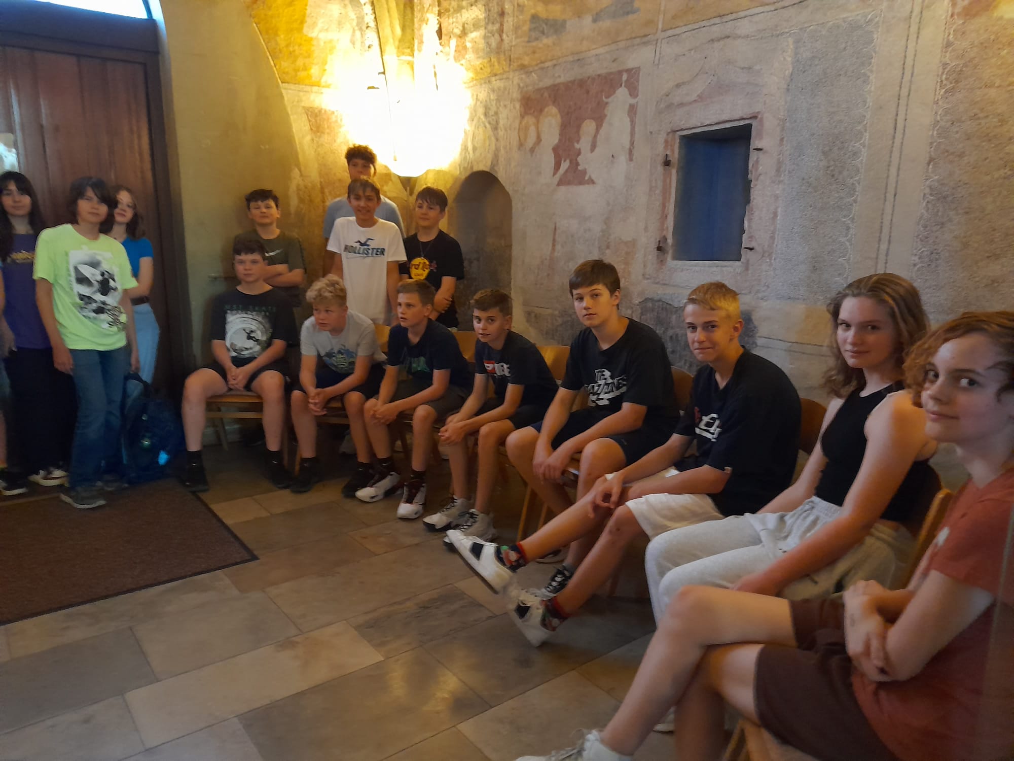 Die katholischen und die evangelischen Schüler und Schülerinnen der Klassen 7a und 7b trafen sich zu einer ökumenischen Begegnung in der Kirche St. Markus. Unter dem Glockenturm, in dem ältesten Teil der Kirche, der aus der Zeit vor der Reformation stammt, konnten sie sich gegenseitig über ihren Glauben befragen und austauschen. Dann führte Anna-Lena ihre Mitschüler durch die ganze Kirche und erklärte die einzelnen Symbole und Kunstwerke. Die zahlreichen Fragen über die Traditionen und Riten in der katholischen Kirche und die Gemeinsamkeiten wie Unterschiede zur evanglischen Kirche beantworteten die Religruppen gemeinsam.