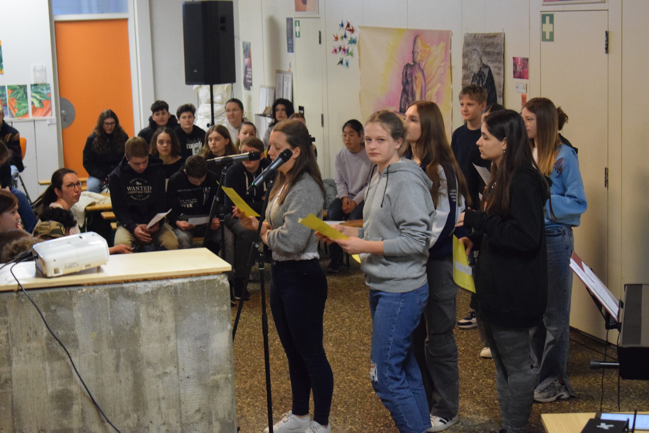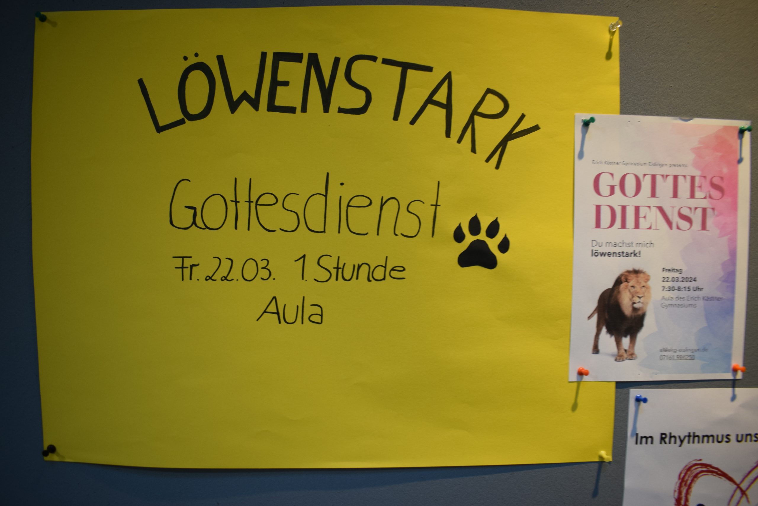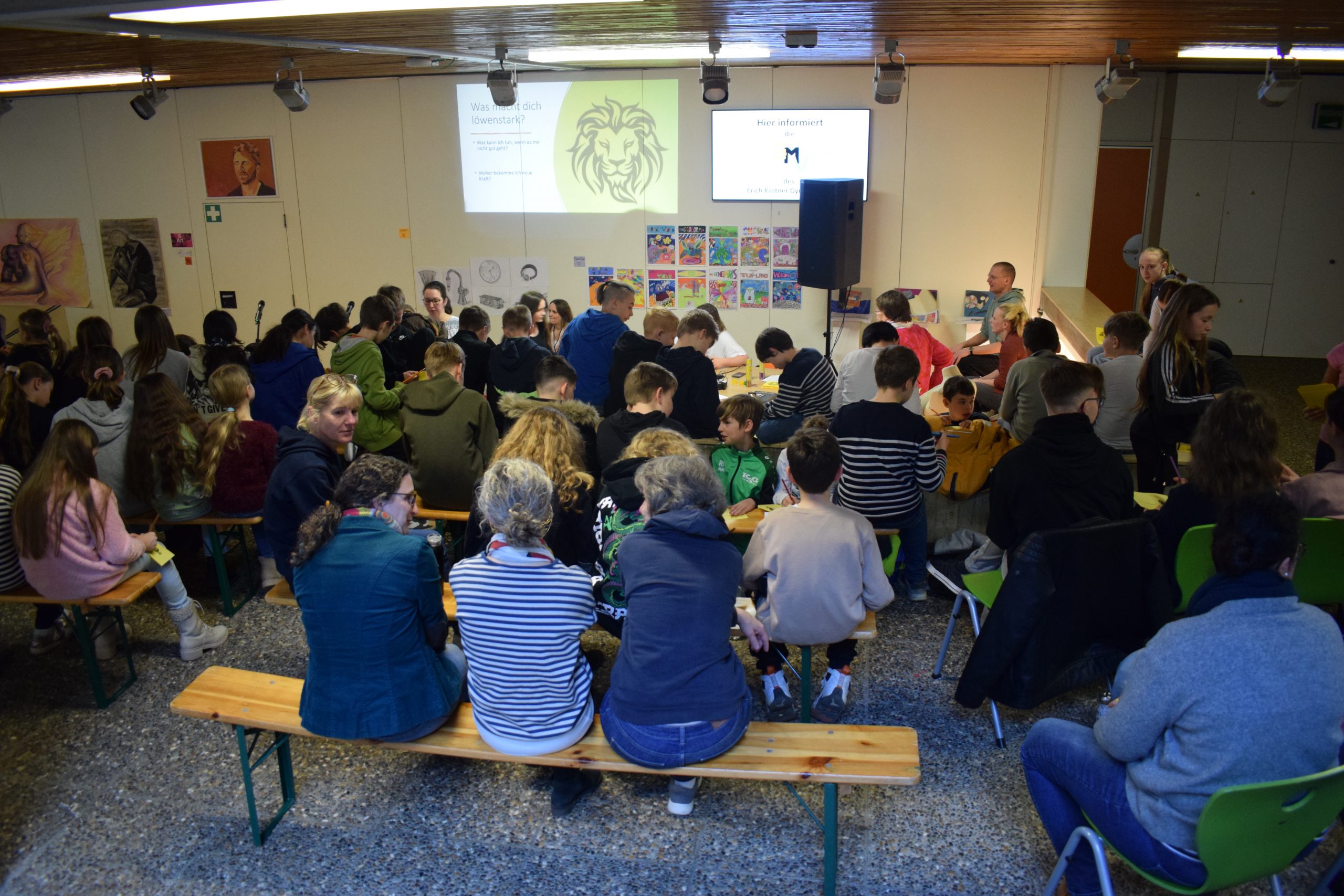 „Ich bin löwenstark und ich habe Mut, ich selbst zu sein, so wie ich bin“, schallte es durch die Schule aus der gut gefüllten Aula, als vor Ostern gemeinsam Gottesdienst gefeiert wurde. Die Texte, die Jugendliche aus verschiedenen Klassenstufen vorbereitet hatten, halfen dabei nachzudenken, wie man aus schwierigen Situationen herauskommt und sich „löwenstark“ fühlen kann. Impulse kamen dabei von der biblischen Geschichte von Daniel in der Löwengrube, dem selbst die Löwen nichts anhaben konnten. Gute Stimmung schafften die gemeinsam gesungenen Lieder. So konnten alles spüren: „Einfach spitze, dass du da bist!“. Das galt auch für die Fünftklässler, die nach der Fünferübernachtung gekommen waren. Auch ältere Klassenstufen bis hin zu den Abiturienten waren an der Gestaltung des Gottesdienstes beteiligt, um den Jüngeren, aber auch sich selbst Mut zu machen für die Herausforderungen des Lebens – und von Gott Mut und Segen zugesprochen zu bekommen.