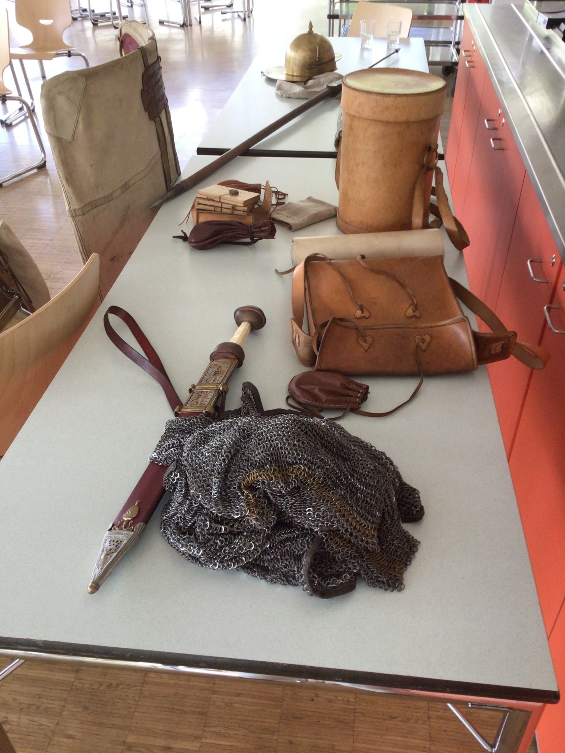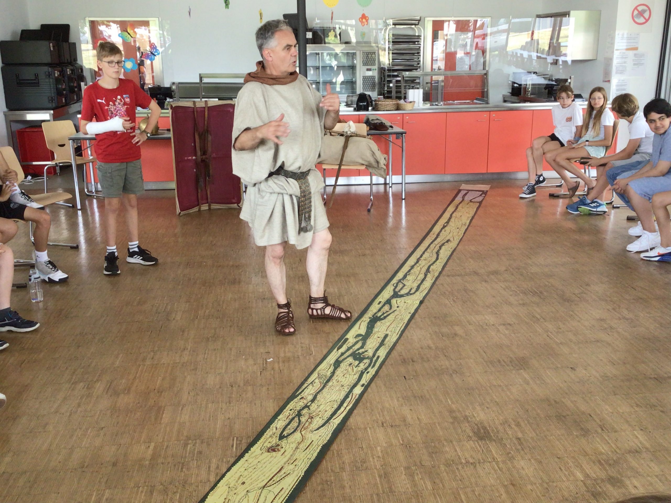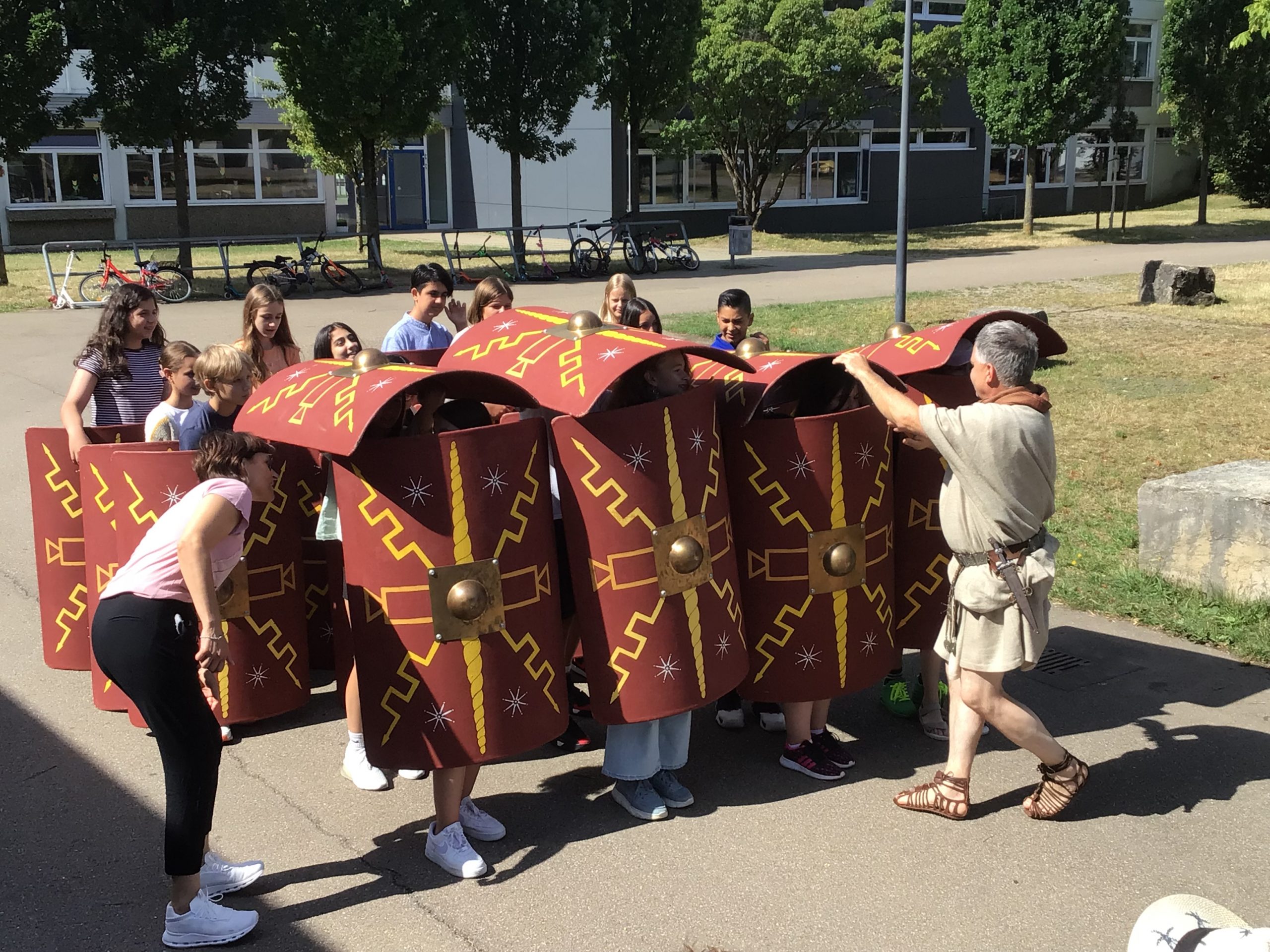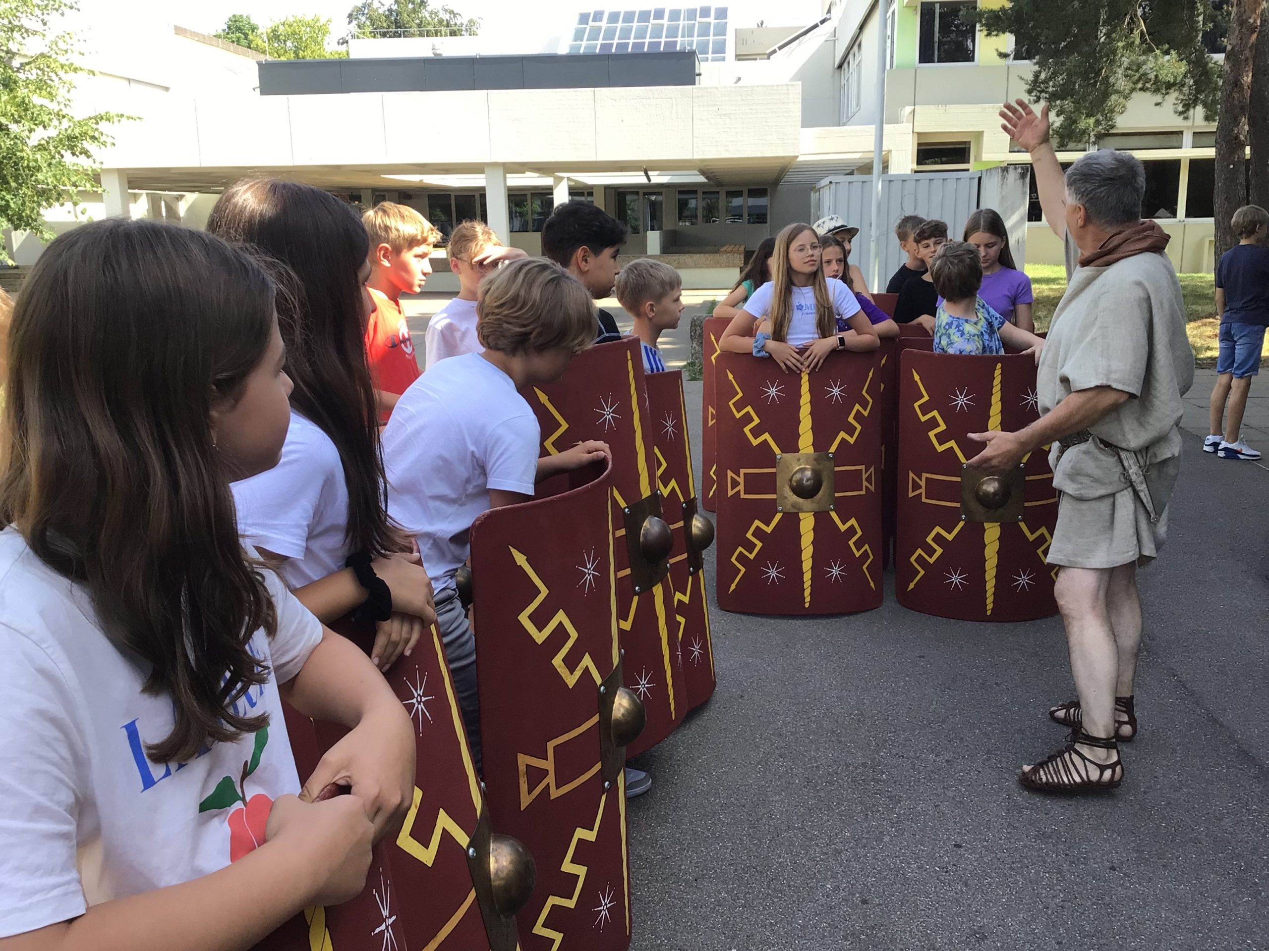 Wie sah der Alltag eines römischen Soldaten aus? Mit welchem Geld wurde im römischen Reich bezahlt? Was hat man damals gegessen? Wer könnte diese Fragen von Schülern des Erich-Kästner-Gymnasiums besser beantworten als der echte Legionär alias Alexander Zimmermann, der die Schüler der 6. Klassen für einige Stunden ins römische Reich entführte. Der Experte für römische Geschichte hat sich seine detaillierte originalgetreue Ausrüstung selbst gefertigt. Er konnte den Schülern so lebendig aus dem Leben der Bewohner des römischen Reiches erzählen, als wäre er selbst dabei gewesen. Die Jugendlichen stellten ihm nicht nur Fragen, sie durften Teile der Ausrüstung auch selbst anprobieren. Höhepunkt war die gemeinsame Formation einer „Schildkröte“, bei der sich eine Gruppe hinter den Schildern verschanzte. Wie schwierig und anstrengend das war, konnten die Schülerinnen und Schüler der 6. Klassen live erleben. Die Jugendlichen waren fasziniert von dieser spannenden Lektion im Geschichtsunterricht.