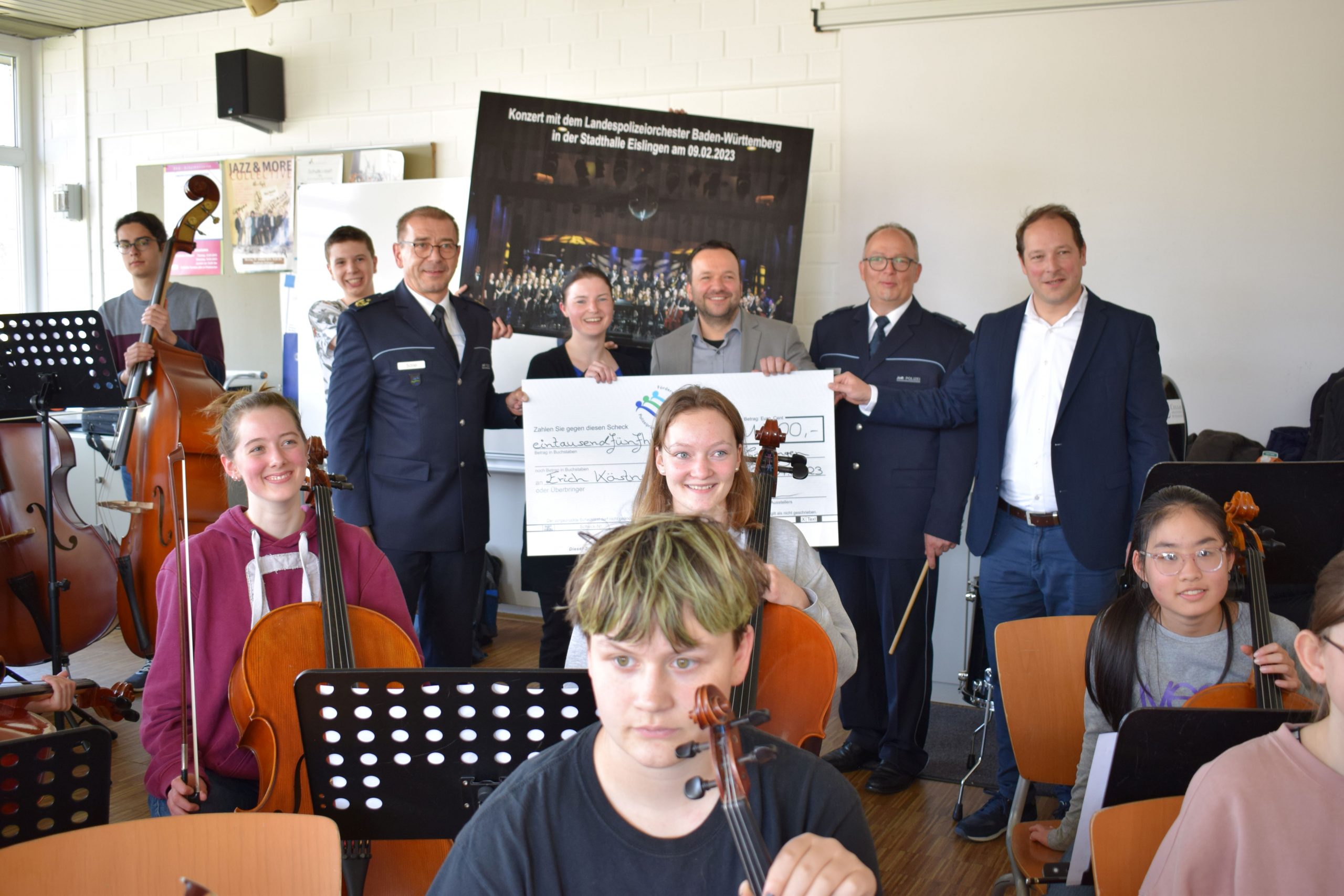 Da staunten die Schülerinnen und Schüler des Oberstufenorchesters bei ihrer Probe am Freitagmittag nicht schlecht. Gleich vier hochrangige Polizeivertreter in amtlicher Uniform erwarteten sie im Musiksaal. Der Anlass war ein sehr positiver: Das gemeinsame Benefiz-Konzert mit dem Landespolizeiorchester in der Stadthalle war so erfolgreich, dass ein stattlicher Erlös erwirtschaftet werden konnte. Der Erlös wird eingesetzt für die Belange des „Fördervereins Polizeipräsidium Einsatz e.V.“. Ein Teil der Spende aber ging an das Erich Kästner Gymnasium für soziale Zwecke. Die Leiterin des Schulorchesters, Stephanie Kapfer, und Schulleiter Stephan Arnold freuten über 1500 €, die nun für die Musikpädagogik und das Schulleben am EKG sinnvoll eingesetzt werden. Den Scheck und ein großes Bild vom Konzert überreichten Polizeioberkommissar Jürgen Eisele und Jürgen Engel vom „Fördervereins Polizeipräsidium Einsatz e.V.“ und Polizeipräsident Anton Saile, umrahmt von den Mitgliedern des Orchesters. Das war ein schöner Abschluss für die gute und inspirierende Zusammenarbeit der beiden Orchester.