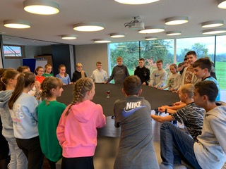 Montagmorgen, 7:30 Uhr. Nach langer Vorfreude treffen sich die Klasse vor der Schule, es ging los nach Allmannsried. Kaum angekommen, wurde der große Garten mit Begeisterung in Beschlag genommen. Ein wunderschöner Sonnenuntergang mit Blick auf den Bodensee rundete den ersten Abend ab. Die weiteren Tage waren geprägt von Wandern, Klettergarten, Kühestreicheln und überaus erfolgreichen Teambuilding-Aktivitäten. Spaß machte auch das von den Schülerinnen und Schülern gestaltete Abendprogramm mit Quizzen, Spielen und Disco. Etwas müde vom vielen Laufen sowie von der vielen frischen Luft und den vielleicht doch etwas kurzen Nächten endete die Klassenfahrt schließlich am Freitag wieder am EKG.