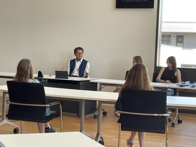 Die Klasse 8b des Erich Kästner Gymnasiums stattete dem Eislinger Rathaus und OB Klaus Heininger am 15. Juli 2022 einen Besuch ab, in dem den Schülerinnen und Schülern die Aufgaben und Arbeitsbereiche der Rathaus-Verwaltung nähergebracht wurden.