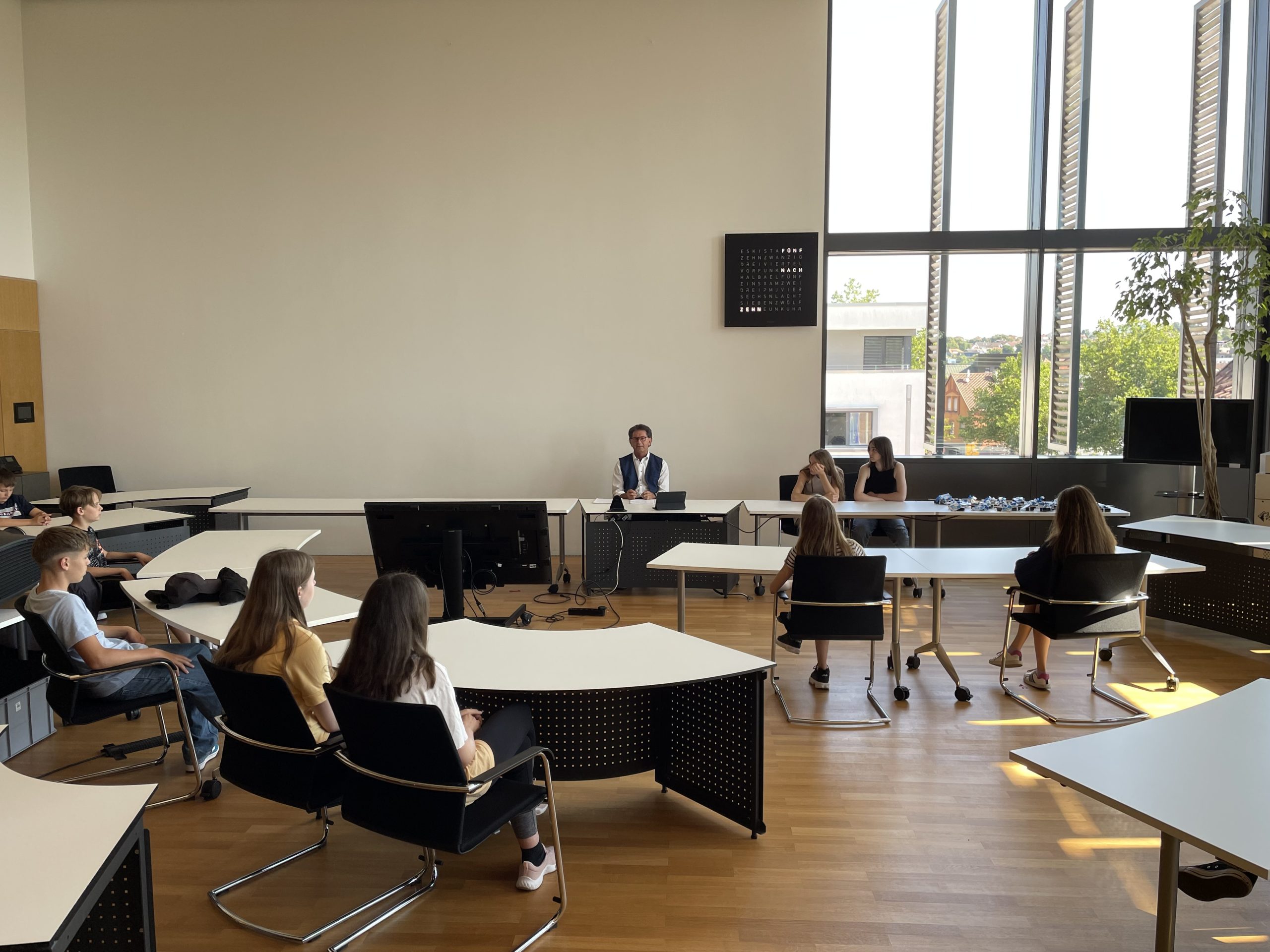 Die Klasse 8b des Erich Kästner Gymnasiums stattete dem Eislinger Rathaus und OB Klaus Heininger am 15. Juli 2022 einen Besuch ab, in dem den Schülerinnen und Schülern die Aufgaben und Arbeitsbereiche der Rathaus-Verwaltung nähergebracht wurden.