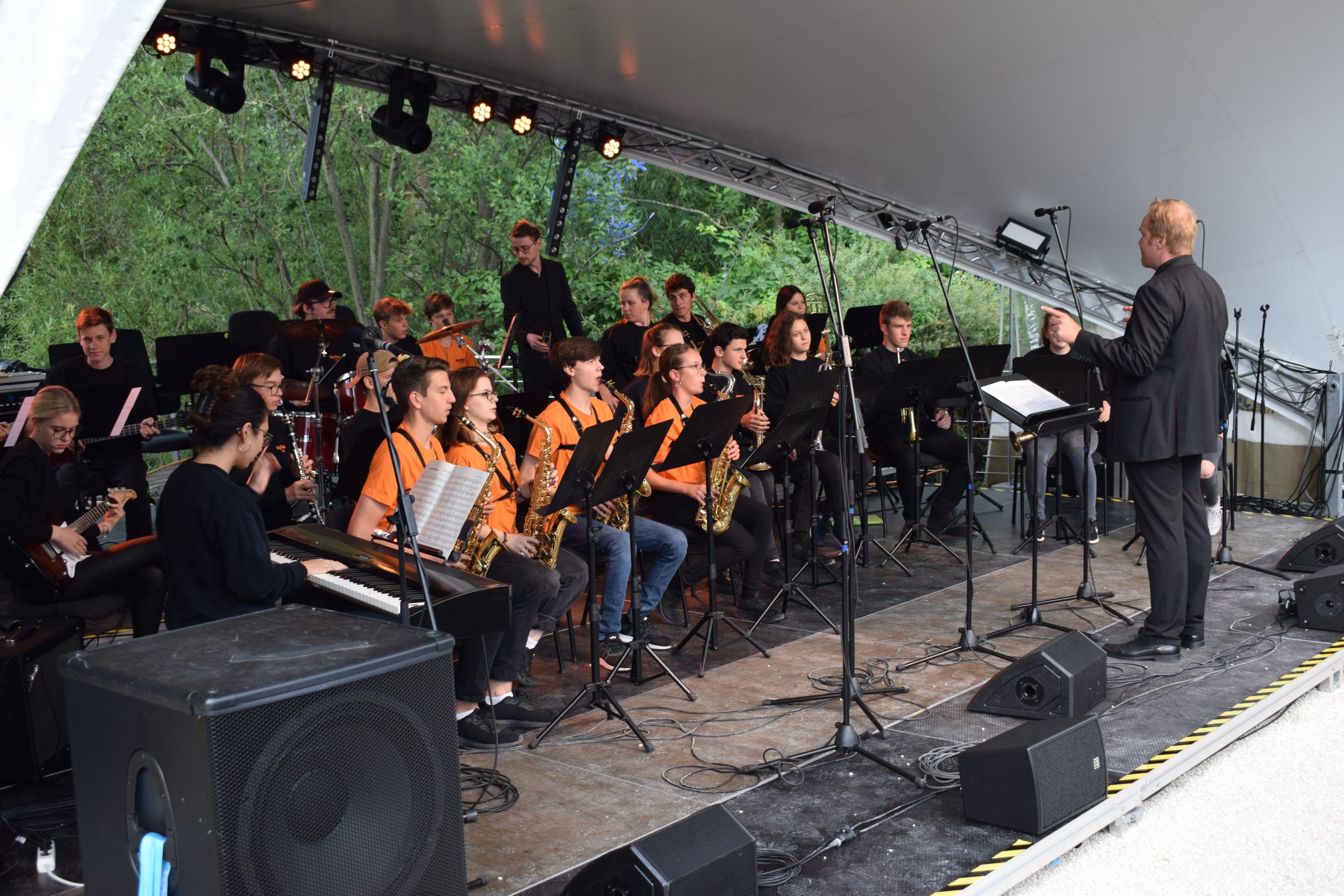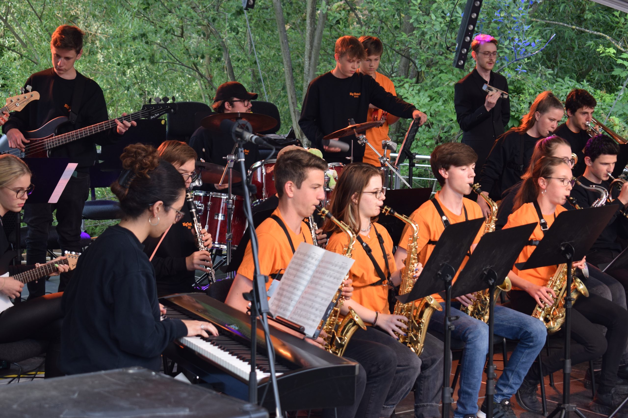 “Good feelings” vermittelte die Bigband des EKG bei dem “Filsterrassen Open Air” -Festival der Stadt Eislingen. Das Gemeinschaftskonzert der Eislinger Musikvereine und Chöre eröffneten die jungen Musiker mit beschwingtem Blues und Soul. Unter der Leitung von Marin Gradner war in der Band wieder die ganze Palette an Instrumenten vertreten. Stimmungsvoll in Farblicht getaucht brachten die Jugendlichen das Publikum auf der Terrasse an der Fils in sommerliche Stimmung und trotzen den grauen Wolken. Die Zuhörer waren in Scharen gekommen. Sie genossen die ungezwungene Atmospäre und erfreuten sich an der live dargebotenen Musik. Die Schülerinnen und Schüler – neu eingekleidet mit EKG-Emblem – waren glücklich darüber, nicht mehr nur in der Schule spielen zu dürfen, sondern wieder Publikum mitreißen zu können. Die Eislinger bedankten sich für die Spielfreude mit herzlichem Applaus.